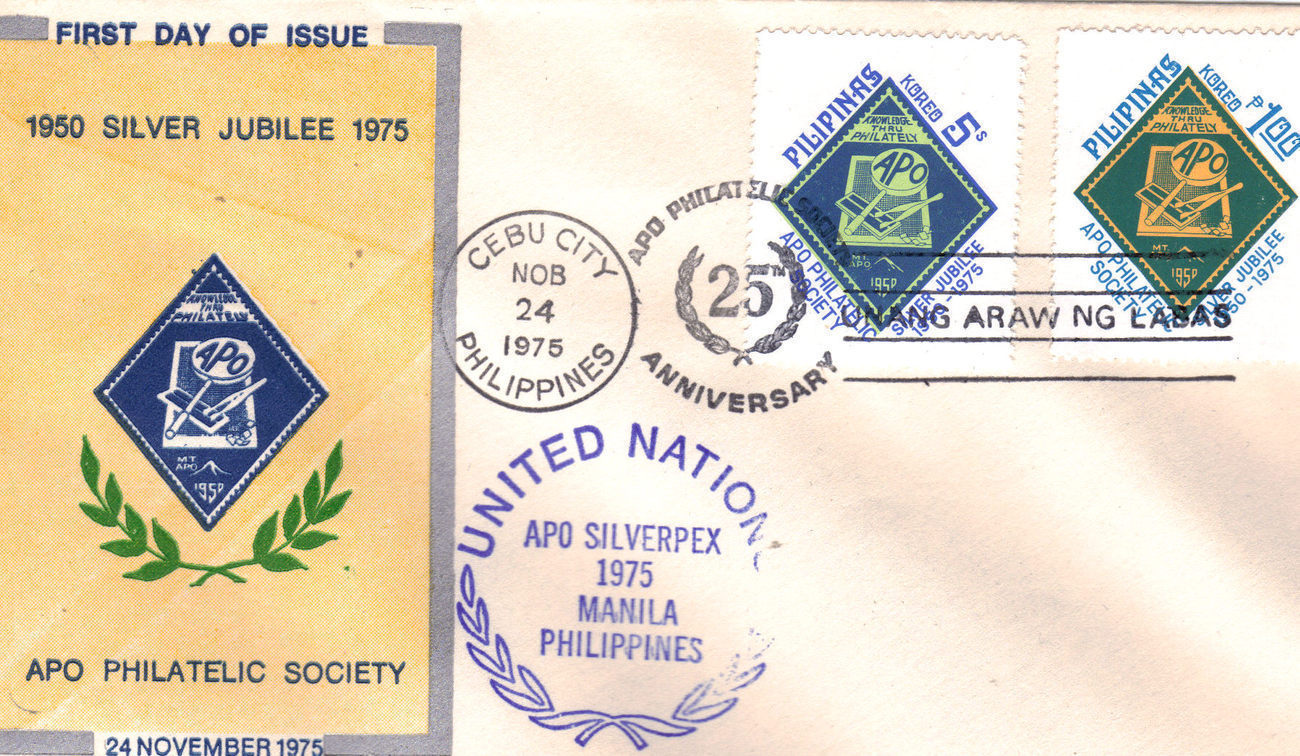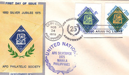 This is the Official First Day of Issue celebrating The silver Jubilee for The APO PHILATELIC SOCIETY (1950 - 1975) 24 November 1975, stamped with the seal of the UNITED NATIONS for APO SILVERPEX 1975 Manila, Philippines.