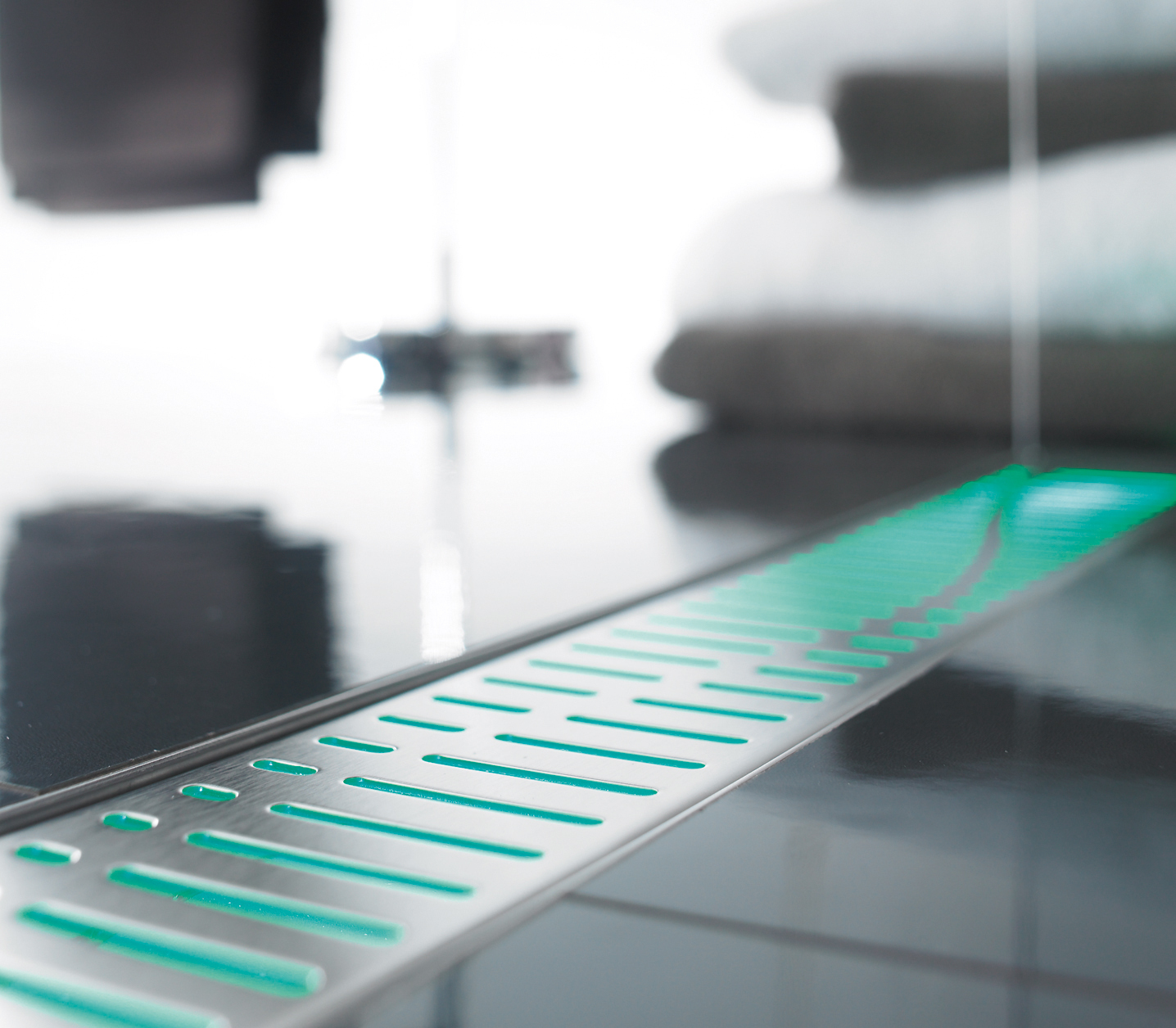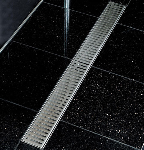 A linear shower channel drain, such as QuARTz by ACO, provide a number of advantages over circular point drains. First of all, flexibility in positioning allows you to place the shower channel drain in the center of a shower or other wet area, against the walls, or let it act as the threshold. As a threshold, it becomes the water barrier that keeps dry zones dry. This allows for more of an open floor plan and traffic flow because it allows the shower or other wet area to be open, without the need of a door.