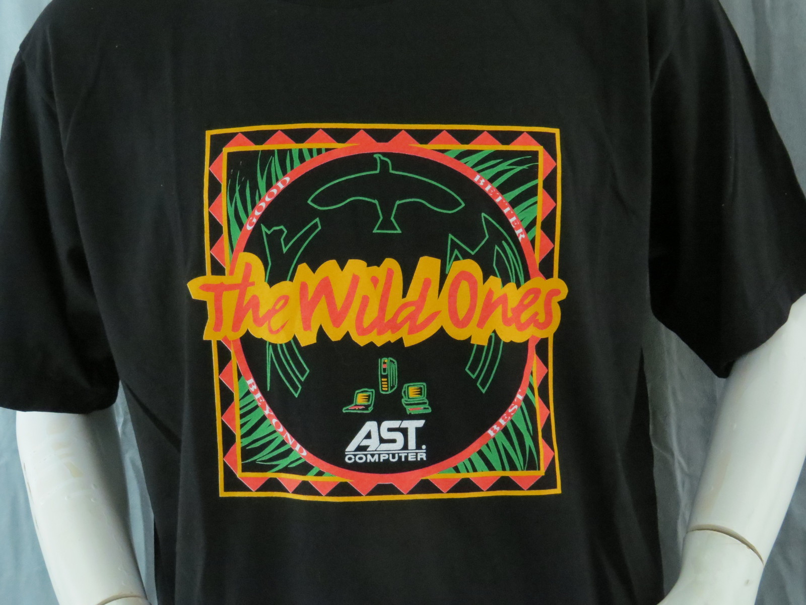 Up for sale is a very unique computer promo shirt. This shirt was made for AST computers when they introduced their computers to Africa. The front of the shirt features an African themed graphic done in vibrant red, yellow and green colours. Across the center of the shirt it states The Wild Ones. Underneath there are graphics of old computers and the AST compture logo. It is tagged made in Kenya. What a unique piece for the tech collector.