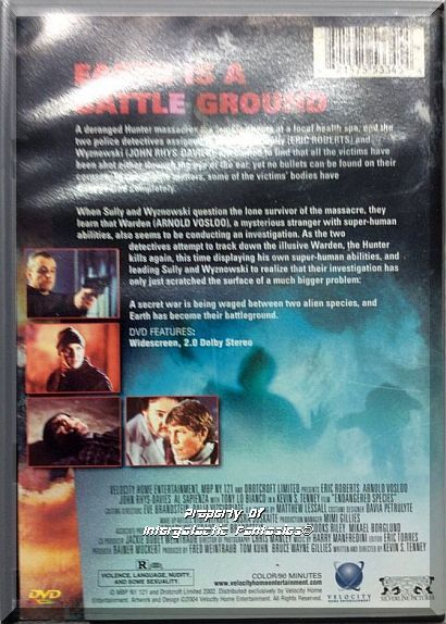 Plot: A deranged hunter massacres the female clients at a local health spa, and the two police detectives assigned to investigate, Sully (Eric Roberts) and Wynowski (John Rhys-Davies), are baffled to find that all the victims have been shot wither through the eye or the ear, yet no bullets can be found on their corpses. To complicate matters, some of the victims' bodies have disappeared completely. When Sully and Wyznowski question the lone survivor of the massacre, they learn that Warden (Arnold Vosloo), a mysterious stranger with super-human abilities, also seems to be conducting an investigation. As the two detectives attempt to track down the illusive Warden, the Hunter kills again, this time displaying his own super-human abilities, and leading Sully and Wyznowski to realize that their investigation has only just scratched the surface of a much bigger problem. 021316-021316P-DVD1