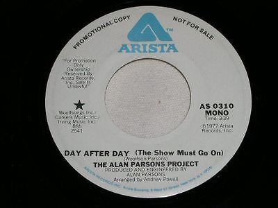 This is the original, vintage, promotional 45 rpm release of The Alan Parsons Project's, "Day After Day (The Show Must Go On)". This is the mono/stereo issue. Record label Arista AS 0310.