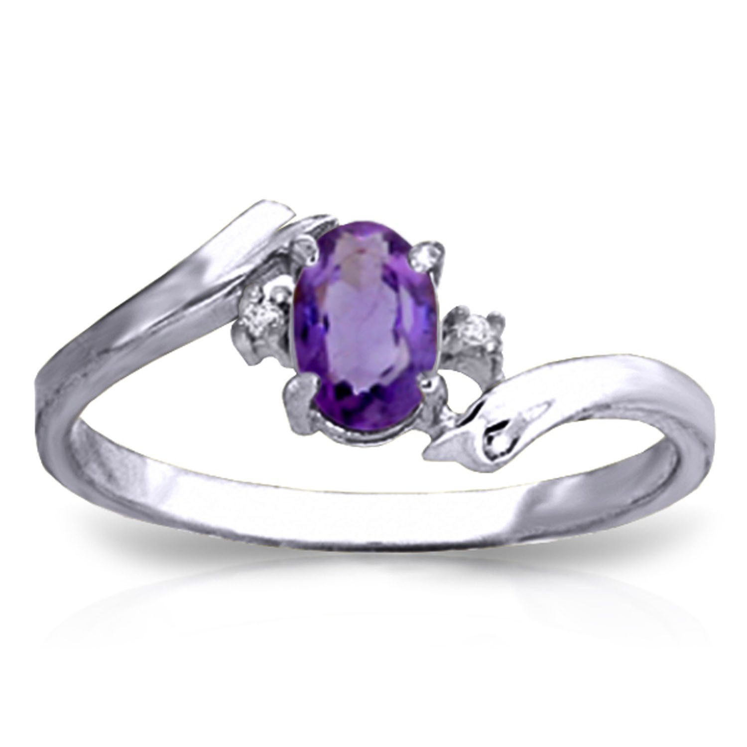 This ring is the perfect birthstone ring for those born in February. Others need not feel left out, however, as it is a simple and elegant ring that can be worn by anyone with a love of natural purple amethyst. This platinum plated 925 sterling silver ring with natural diamonds and purple amethyst has a sleek design that allows the gemstones to shine beautifully against the real Platinum Plated 925 Sterling Silver band. The .45 carat oval shaped amethyst has the rich purple color that is loved universally. Two round cut diamonds add even more shine to this simple, classic looking ring that is perfect for any occasion. All sizes are available, including half sizes