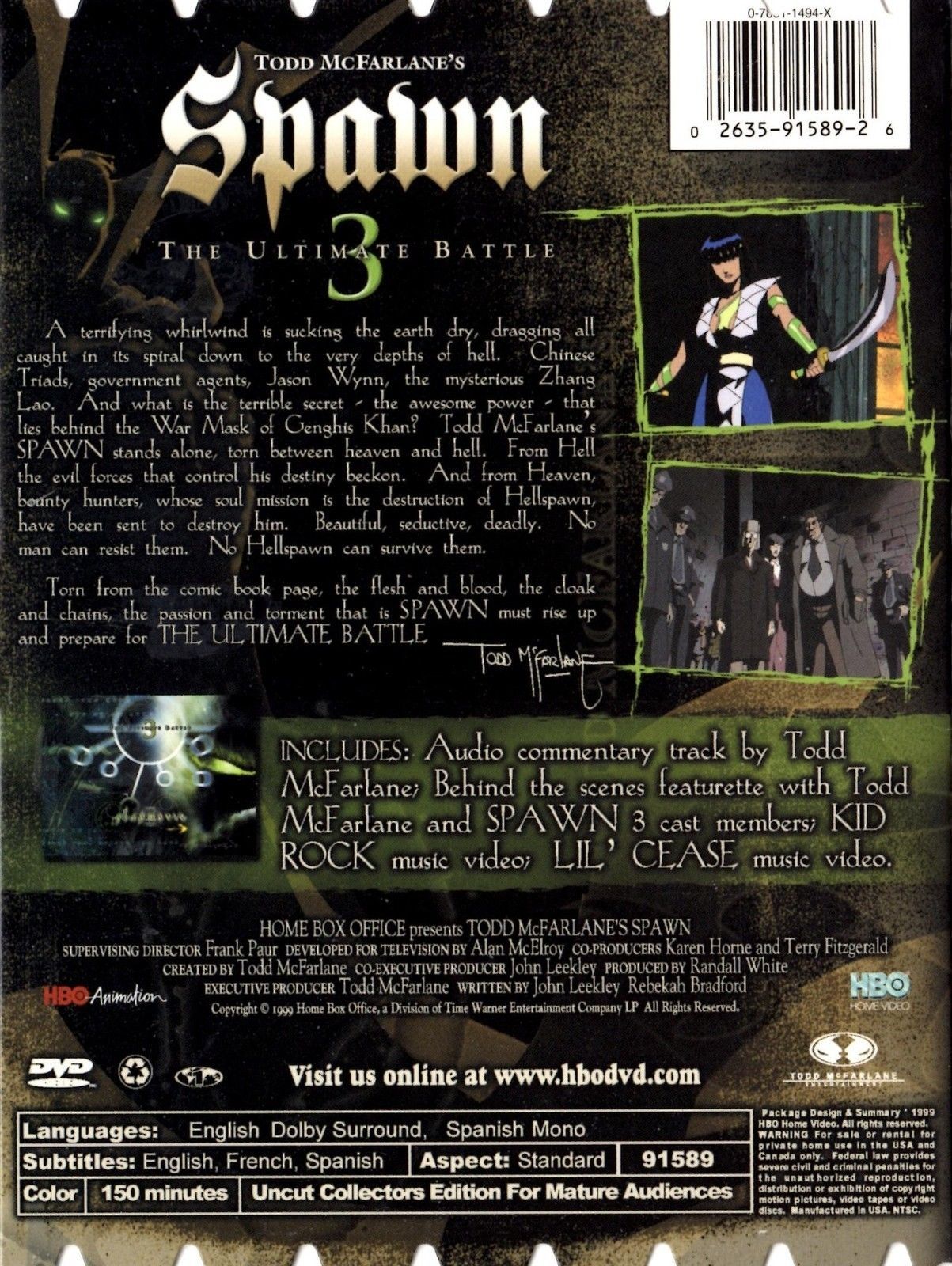 This is a previously viewed DVD of the rare classic animated horror fantasy SPAWN 3 - THE ULTIMATE BATTLE, staring the voice talents of: