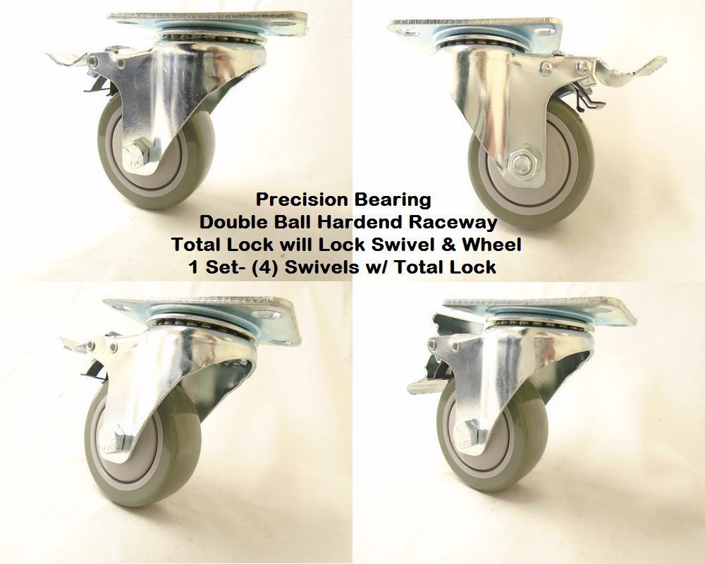 3" x 1-1/4" Swivel Casters Polyurethane Wheel w/ Total Lock Brake 300lbs ea. (4)