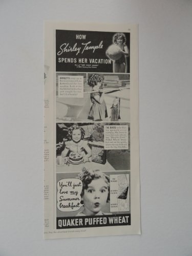 Quaker Puffed Wheat, 30's Print Ad. B&W Illustration (How Shirley Temple spen...