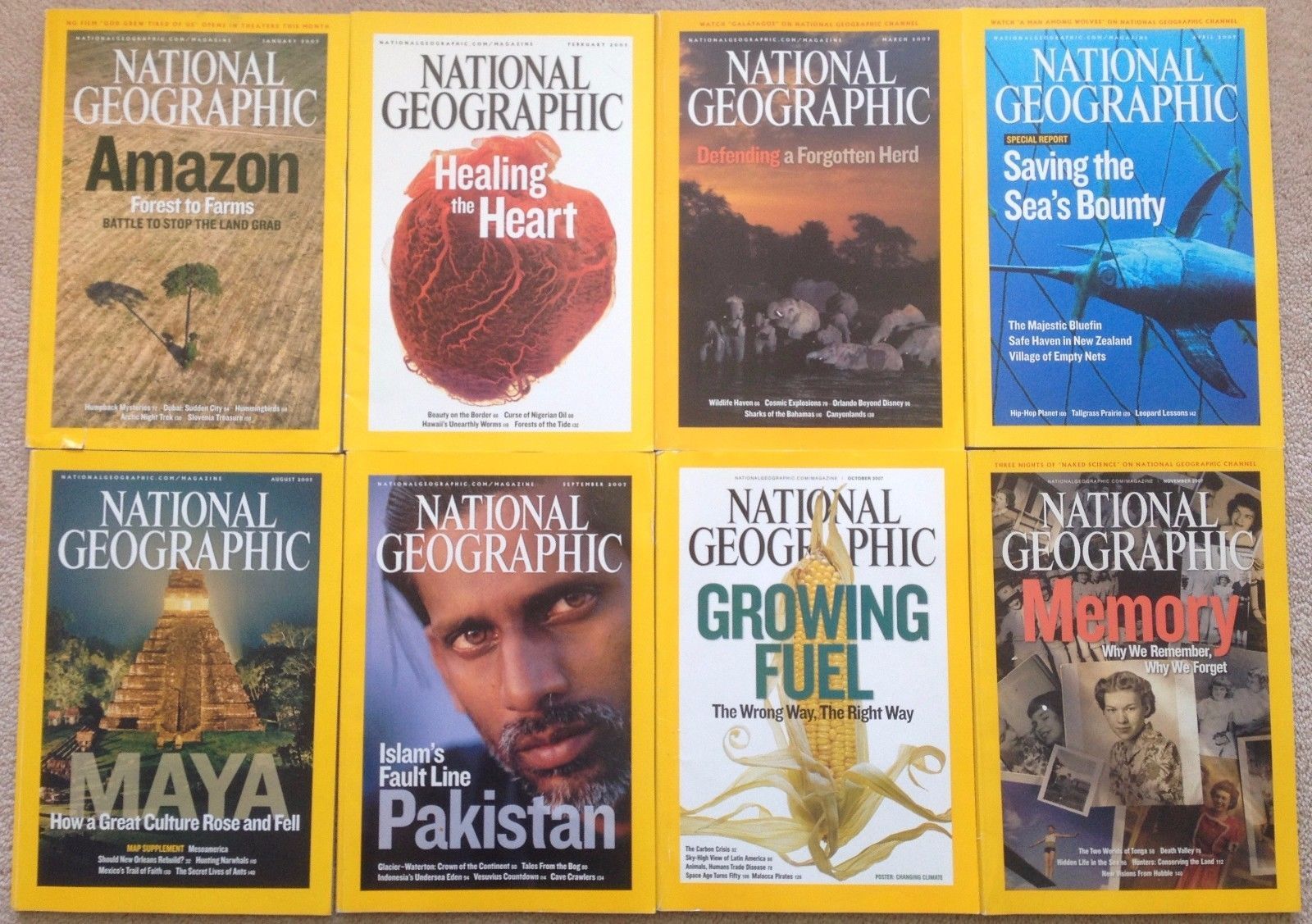 This lot of 8 2007 National Geographic magazine issues is from non-smoking home.Some cover wear: chipping to Amazon issue and back bottom corner scuff damage. A few pages show reading wear and a few have deep corner folds (example Image 5). Please see photos. No Changing Climate poster or Maya map included.