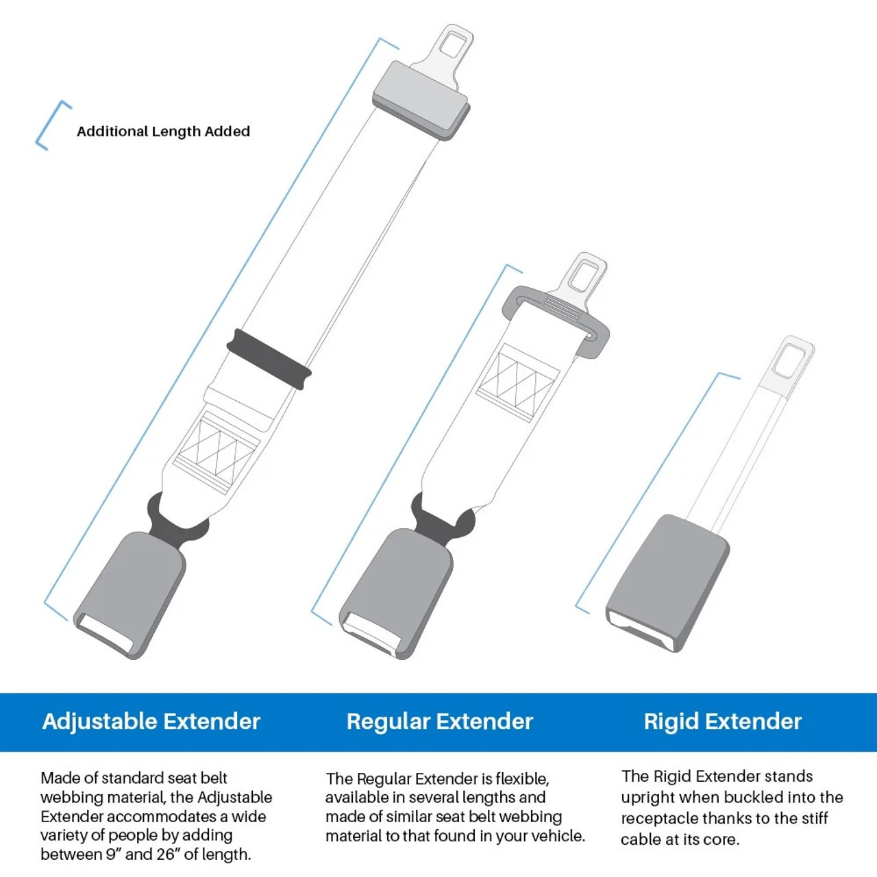 Adjustable Extenders: adjust from 9.5" to 26" and excellent for accommodating a wide variety of needs and passengers.