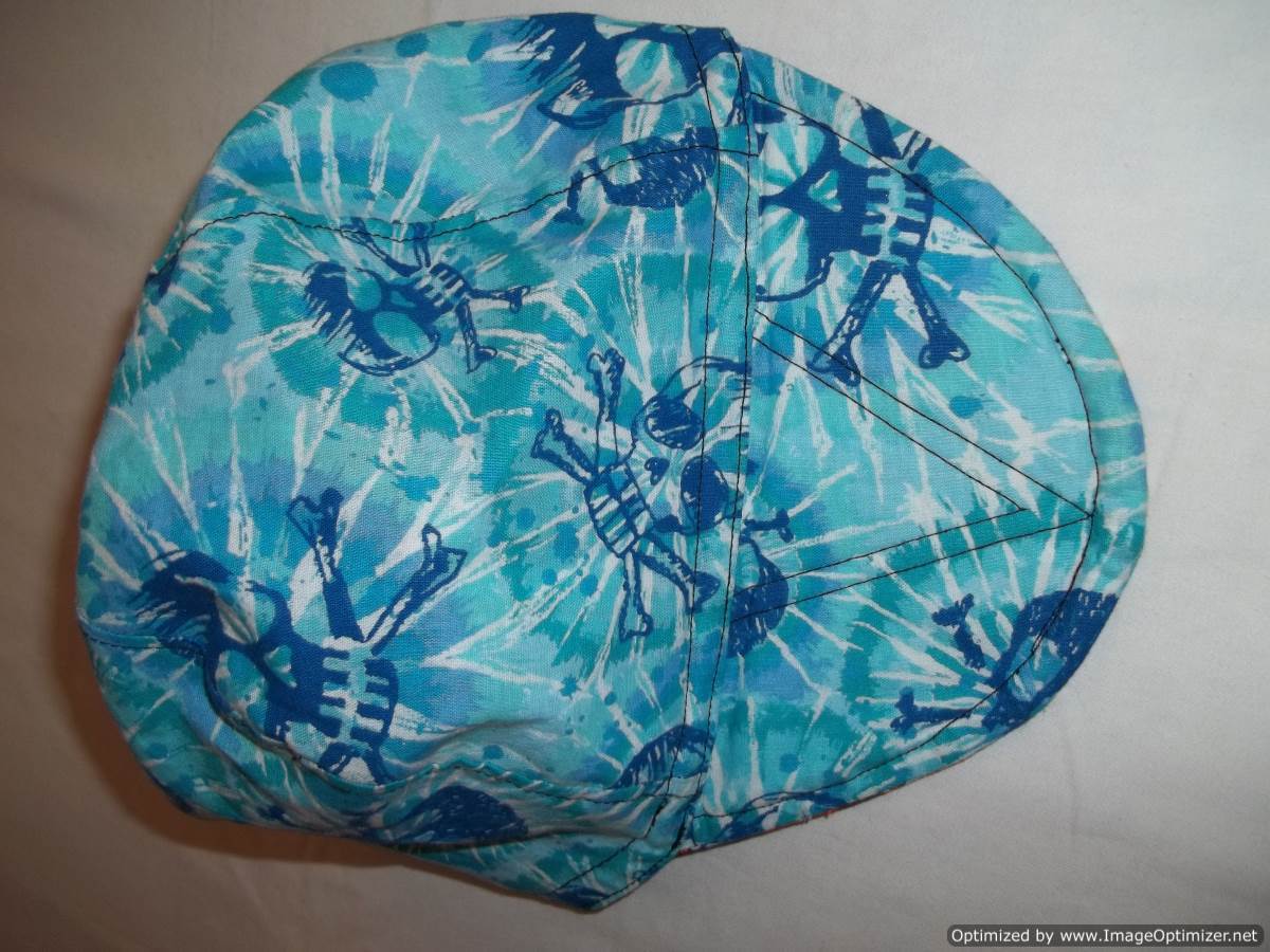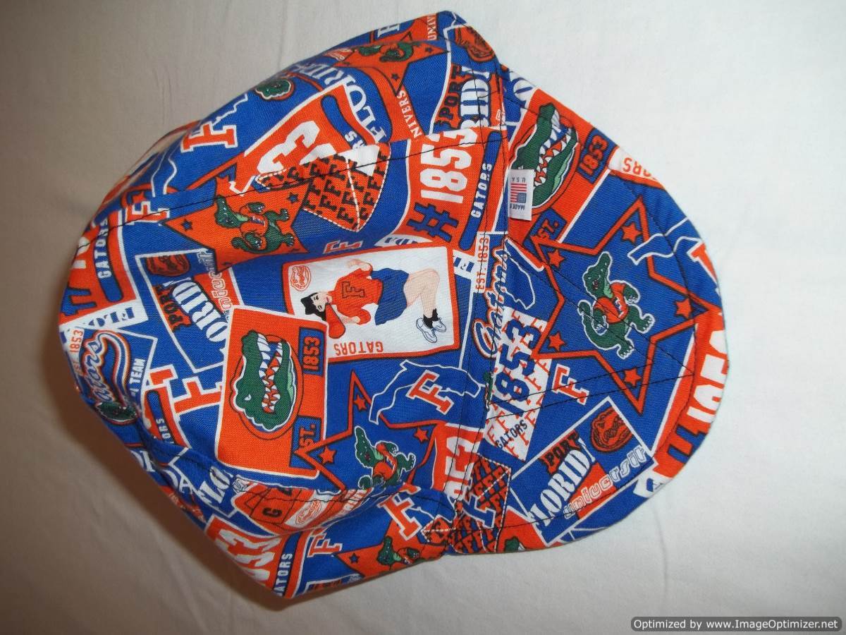 On one side is the Florida Gators print in colors of blue, orange, white and green with a American flag on a small tab in the front and on the other side is a skull and bones in colors of turquoise green, blue and white.
