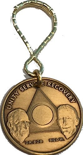 Beautiful 1.31 inch diameter bronze recovery chip Key Tag. Features raised graphics and lettering with the AA Founders Bill W and Dr Box on the front and no number (plain front) so this is a timeless item. Durable short keytag for compact form factor. Made in the USA.