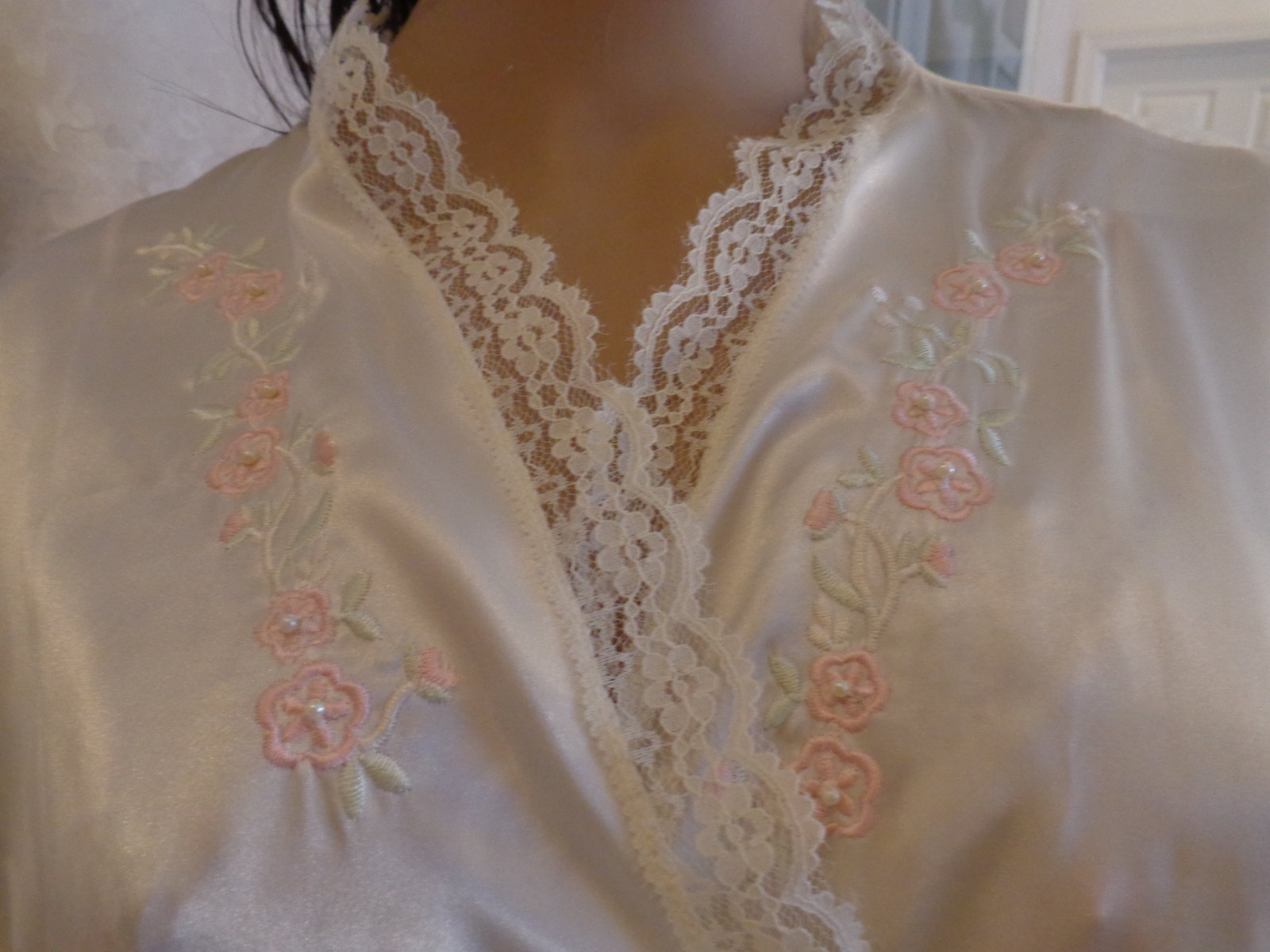 This Beautiful 2 PC. LA INTIMATES LINGERIE by GILLIGAN O’MALLEY (#0969) It is made by Gilligan O’Malley from the finest collection of Intimate Apparel, offering exceptional quality through perfect fit, fine fabrics and delicate details, size medium. It consists of an outer robe and a matching nightgown. It is adorned with a delicate embroidered pink and white floral design and trimmed with lace. This is the perfect gift for the bride for her wedding night. The size is medium, the material consists of 100% Polyester and made in the Philippines. Machine wash cold, gentle cycle, line dry.