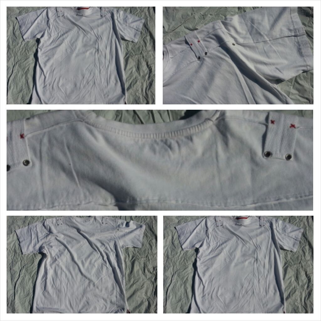 Description: Mens designer short sleeve designer t- shirt. The shirt has miltary style shoulder tassels sewn on to add flare to the detailed item.Solid design tee, soft cotton tee . New with tags. Authentic allways!!