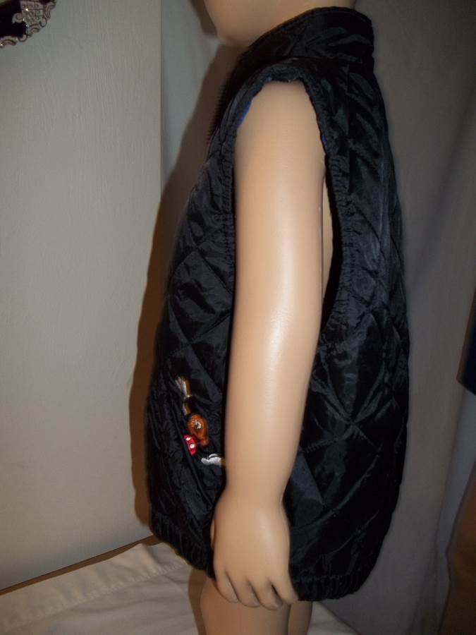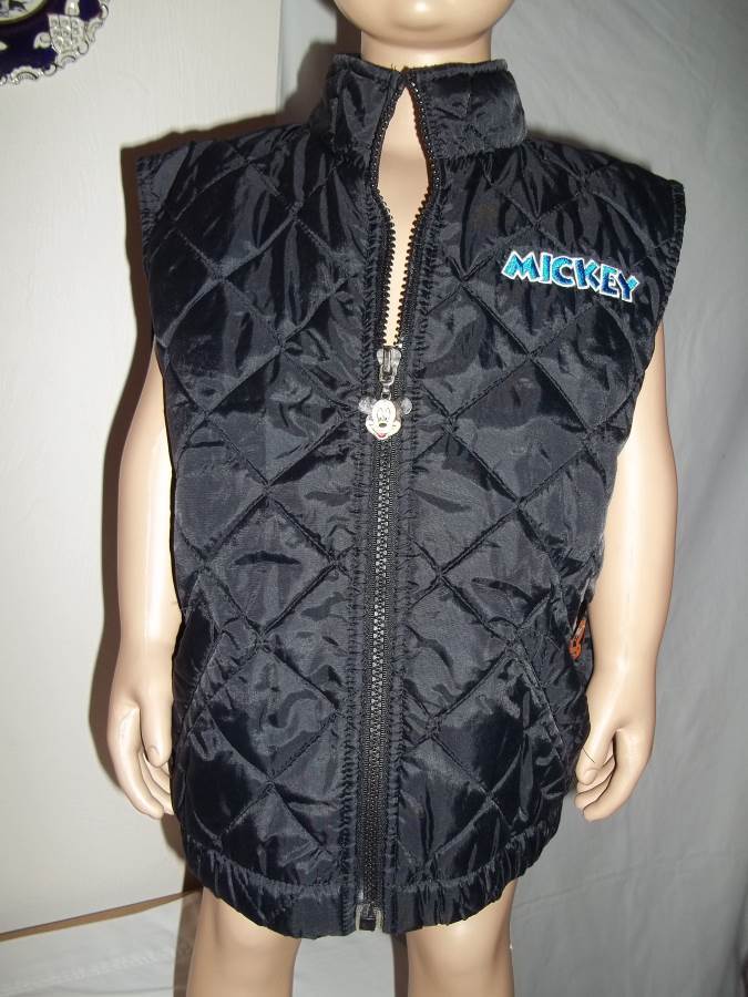 Disney Mickey Mouse Child's Quilted Vest with Mickey on front left side and Pluto on right, Mickey lettering on top left side, has a zipper front with Mickey fob attachment . In clean preowned very good condition. Label inside is marked Mickey For Kids.