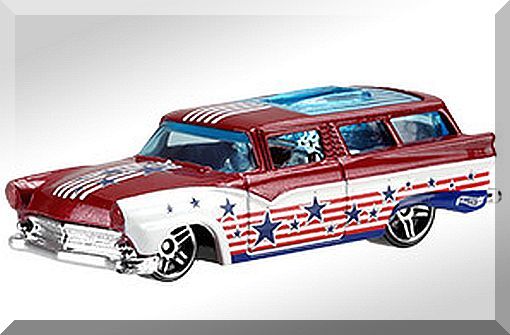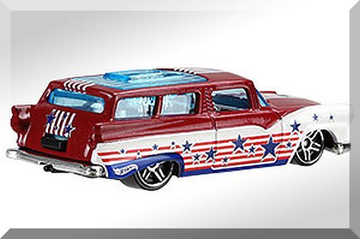 Description: Metallic Red, w/Chrome interior, White below bodyline on sides with red stripes and dark blue silver stars. Silver Hot Wheels logo on rear sides. White stripes over hood, roof tailgate. Dark blue silver stars on hood tailgate, Black Malaysia Base, w/ChrPR5's. 060516-060516P-D12
