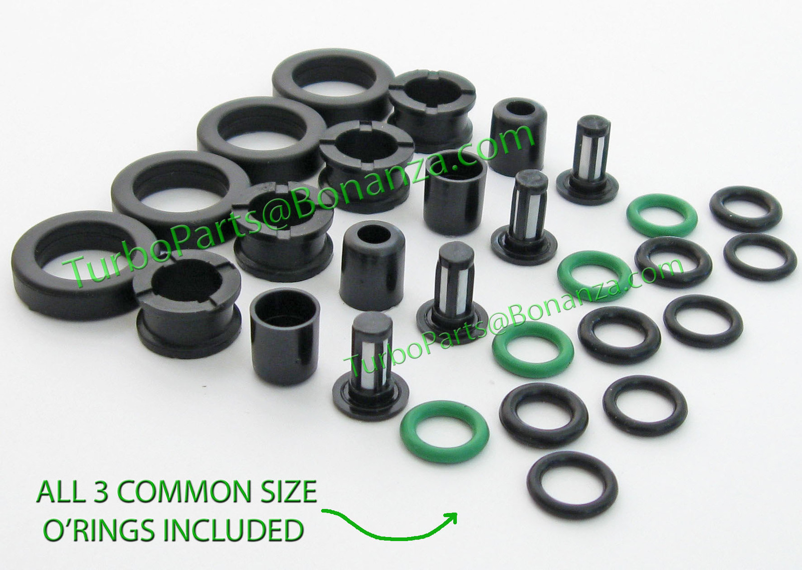 The most complete 4 cylinder Fuel Injector Repair / Service kit for Honda fuel injectors (Accord, Civic, Prelude, etc.) Will also fit Acura injectors. Kit contains 12 O-rings, 4 Upper Grommets, 4 Lower Seal Rings (lower grommets), and 5 Micro basket Filters (4 are sown in picture but we include 1 extra) and 5 Pintle Caps (4 are shown in picture but we include 1 extra). Lower seal rings are oem p/n 16472-P0H-A01. Parts will fit the style of fuel injector as shown in the picture. 12 O-rings are included because Honda injectors used slightly different size/material upper O-rings throughout the years. Therefore, all three common type/size of upper o'rings are included. Clogged micro basket filters are a source of fuel injector malfunction. (Fuel injector is shown for illustrative purposes and is not included in the sale). Free shipping within the USA. Shipping cost to Canada is $9.00. Paypal accepted.