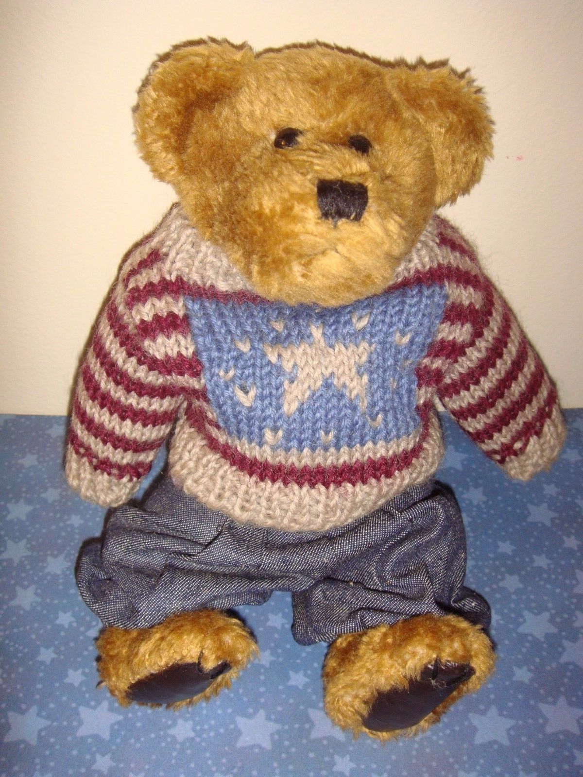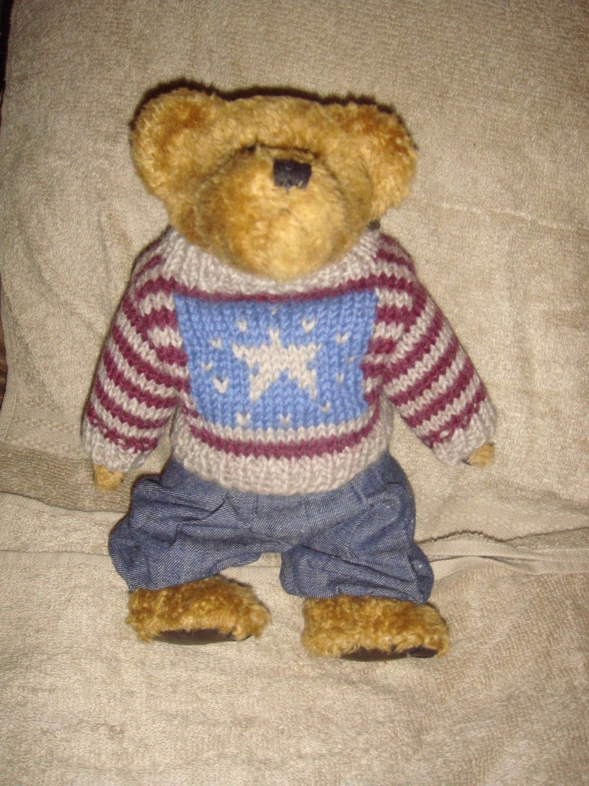 Is A Golden Lite Brown Bear Wearing Denim Overalls With A Patriotic Sweater.