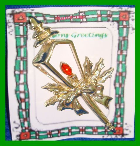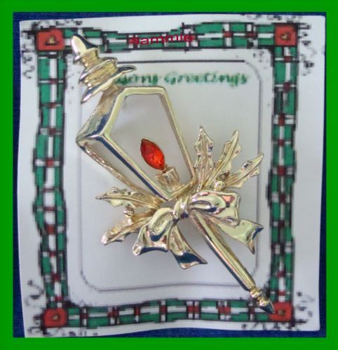 This is a RARE Goldtone Pole Lantern Candle Pin. It has Red Crystal/Rhinestone for the Candle Flame. The Holly and Bow are Goldtone. This is a very pretty and unique looking pin.