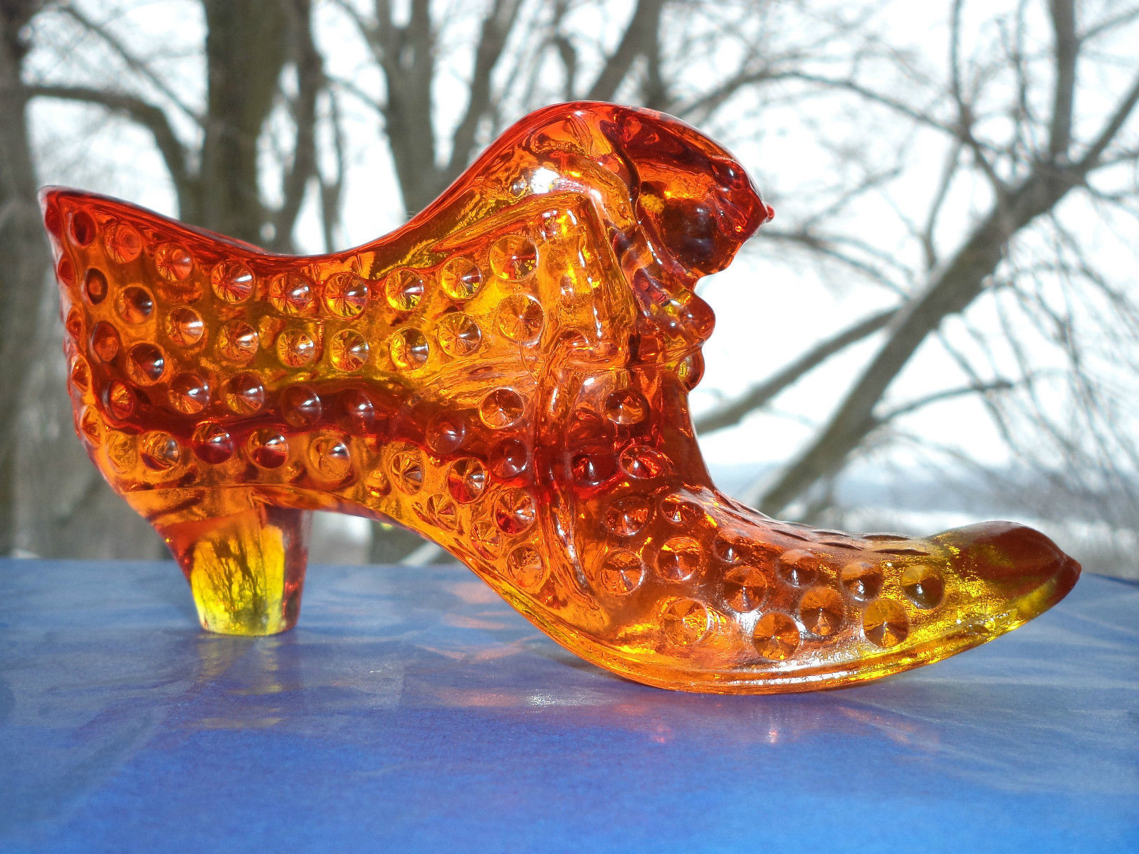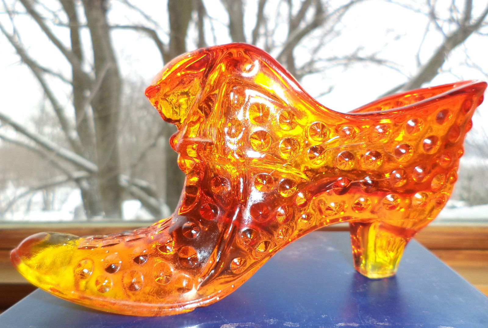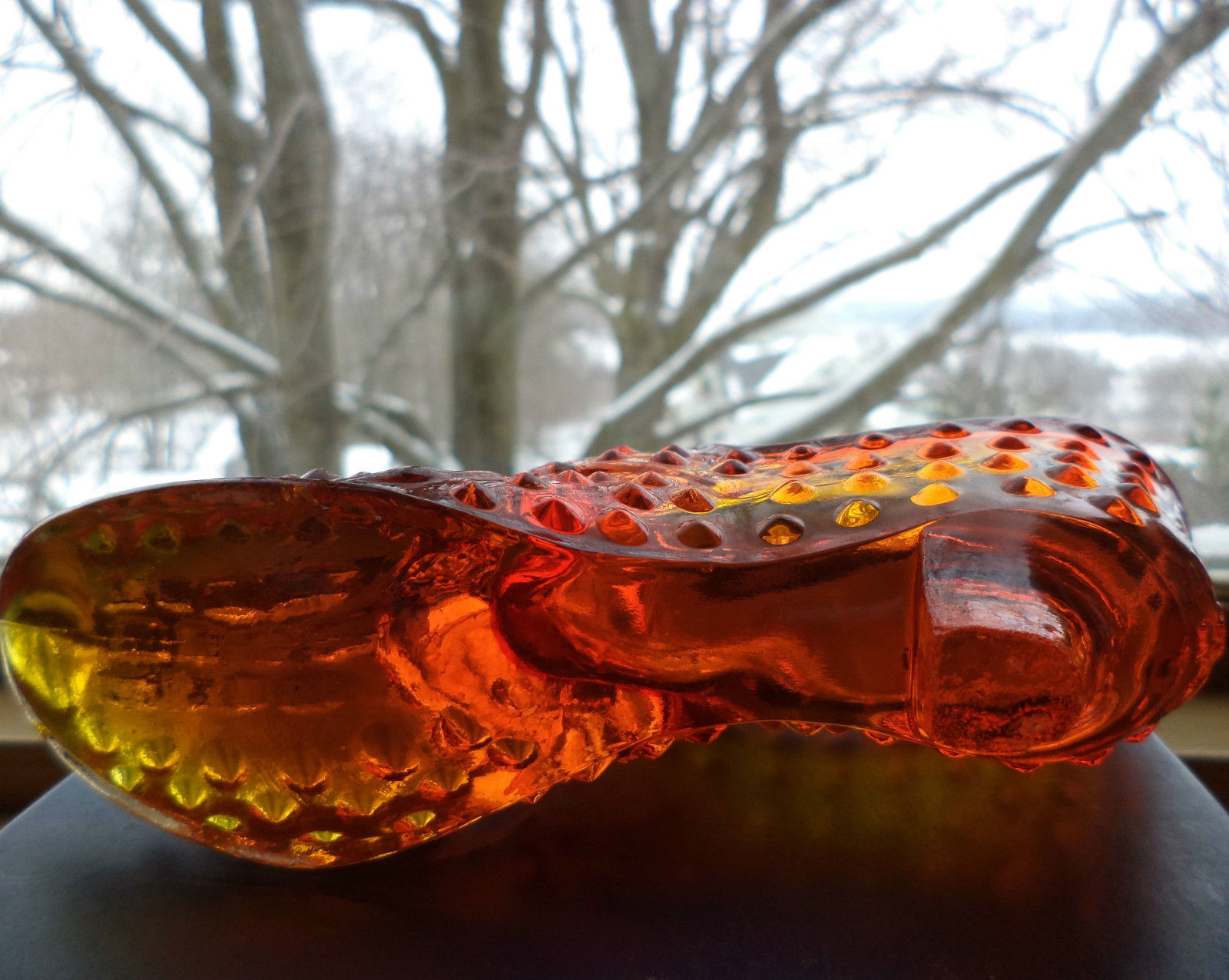 Vintage large 6" Fenton hobnail orangina amber glass slipper Victorian shoe CAT motif Tiny chip on the side of the sole, hardly visible, only when you run your finger along the edge.