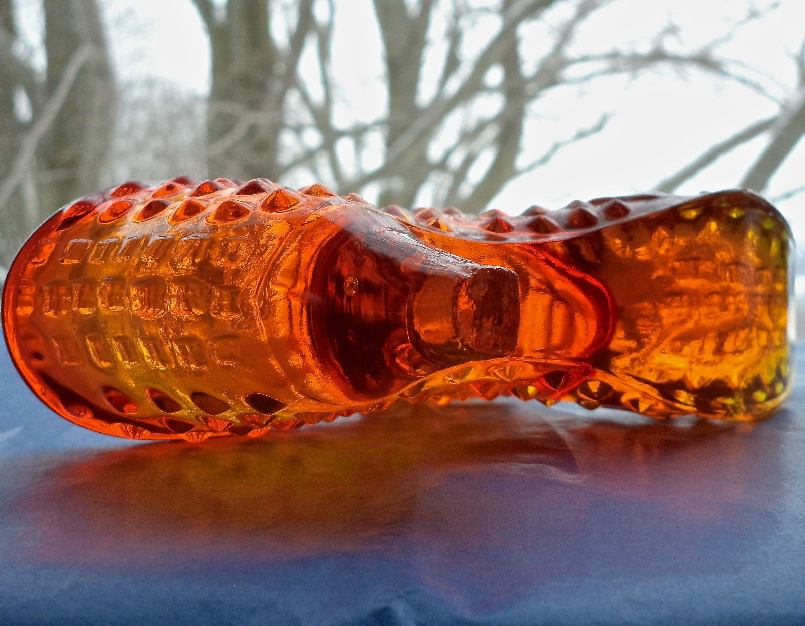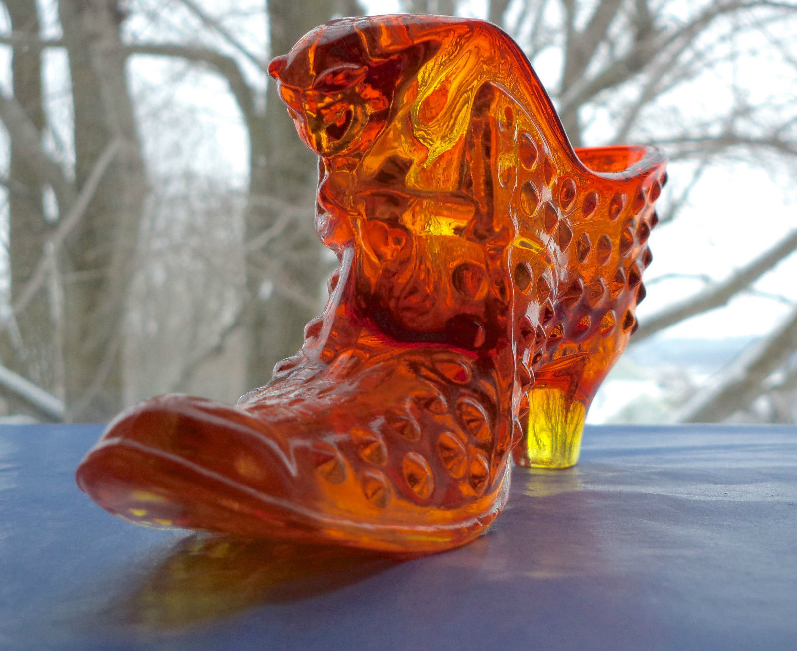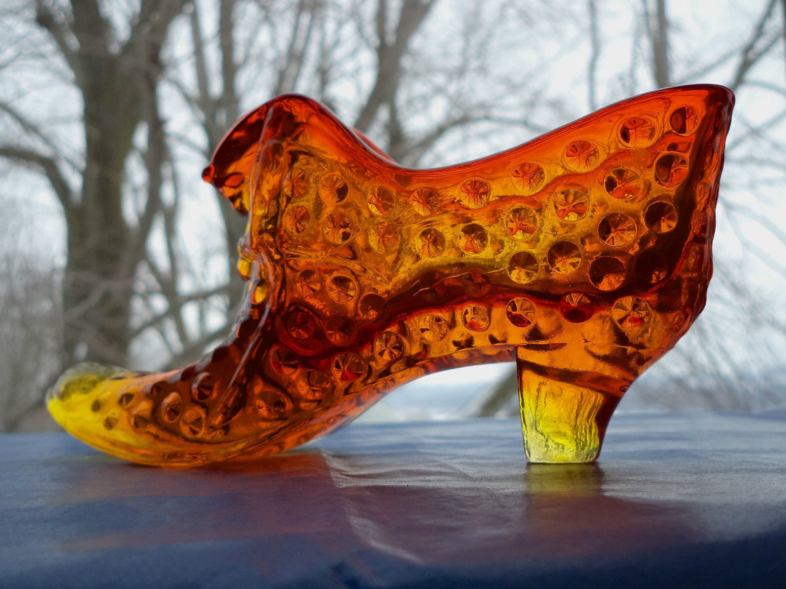 Vintage large 6" Fenton hobnail orangina amber glass slipper Victorian shoe CAT motif Tiny chip on the side of the sole, hardly visible, only when you run your finger along the edge.