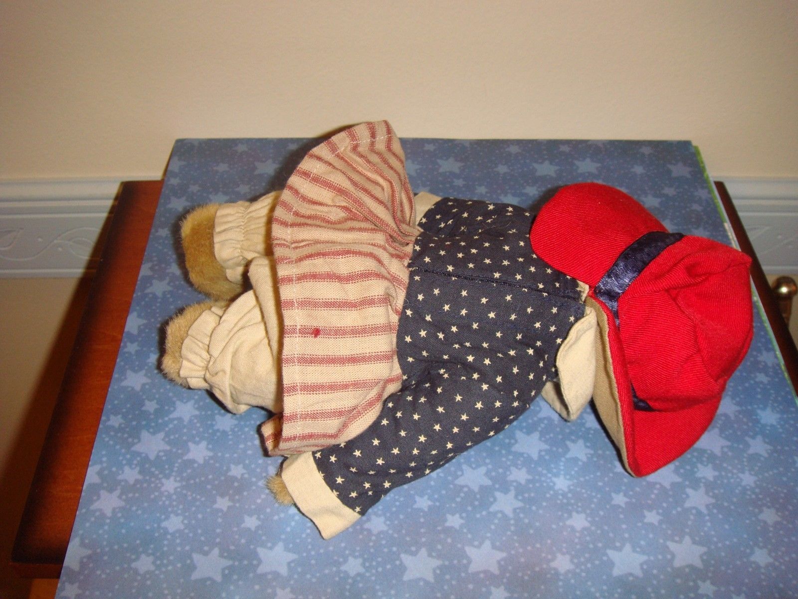 She's Wearing A Beige Pantaloons With Blue, Beige, And Red Dress. The Top Half Of The Dress Is Navy Blue With Beige Stars And 3 Red Rosettes Up To Collar. Bottom Half Is Beige With Red Vertical Stripes. She's Also Has Red Hat With Beige Under Side.