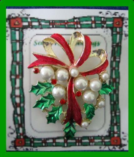 Ribbon, Faux Pearls, Holly Berries Enamel Goldtone Brooch Excellent Condition HOLIDAY Brooch/Pin