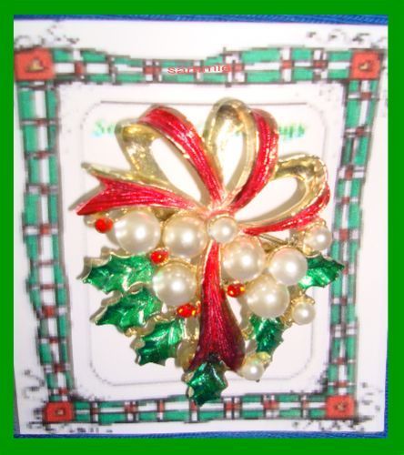 This is a Goldtone Pin/Brooch with a Red Ribbon, 6 Green Holly Leaves, 4 Red Rhinestone/Crystal Berries 10 Faux Pearls. This is a really beautiful/pretty piece of jewelry.