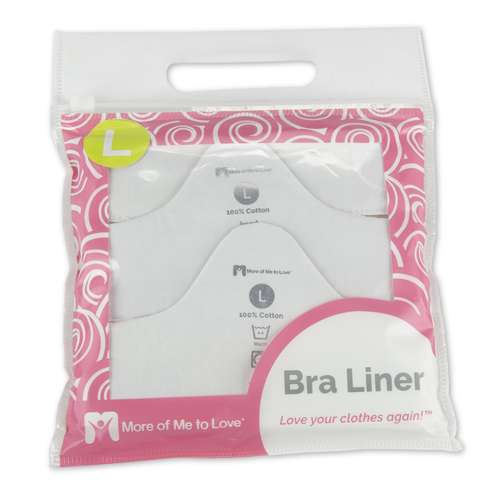 The More of Me to Love Bra Liner is the premier bra liner and part of the "Love Your Clothes Again" line. This incredible bra liner is top quality, made of cotton, and is comfortable and machine washable. The liner is held in place by the tension of the bra or the weight of the breasts, and it wicks sweat, prevents irritation and chaffing and makes wearing bras a far more comfortable experience.