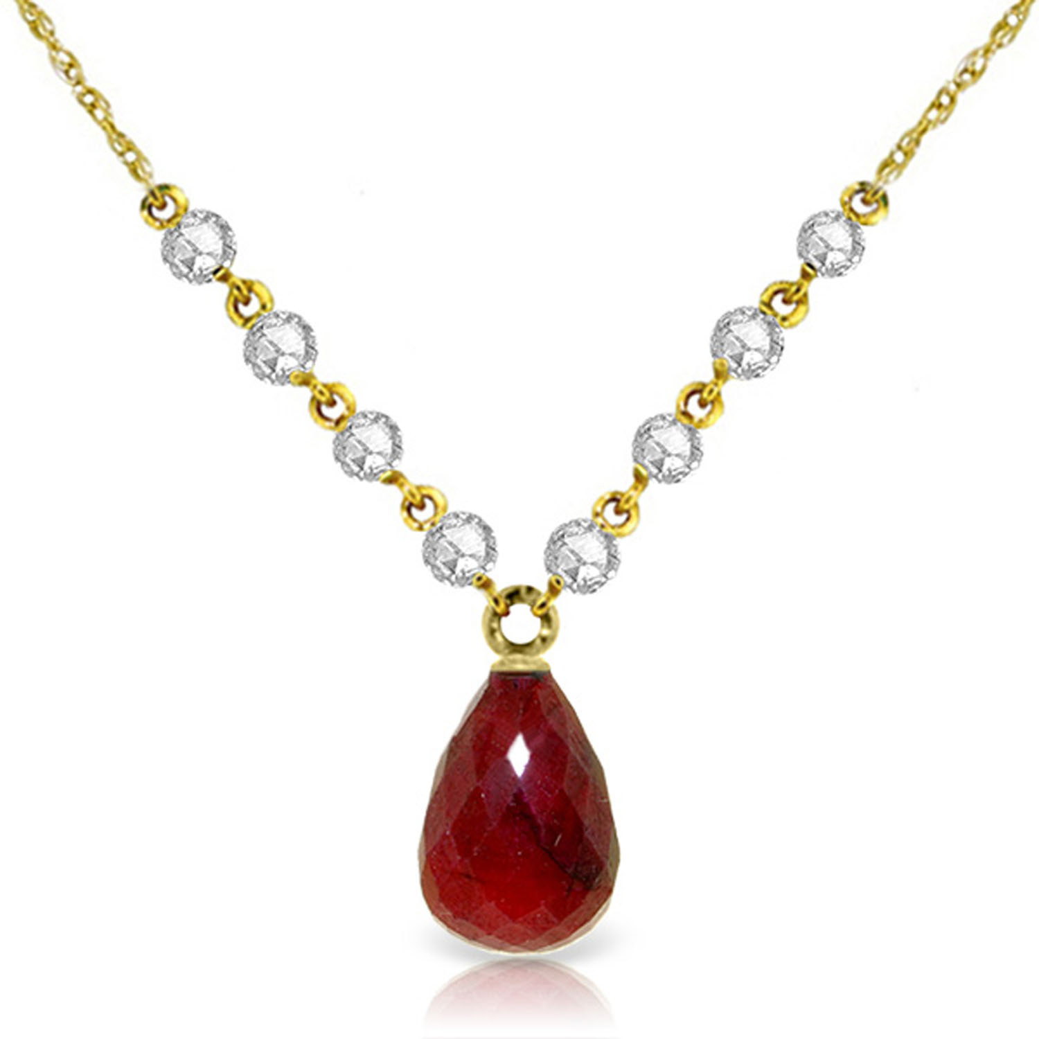 Includes 18" long, 1.15 mm thickness double link Rope Chain. A Natural Ruby briolette pendant having a 0.80 total carat weight with natural diamonds suspended in this 14 karat Solid Gold Necklace.. Length options from 14" to 24".