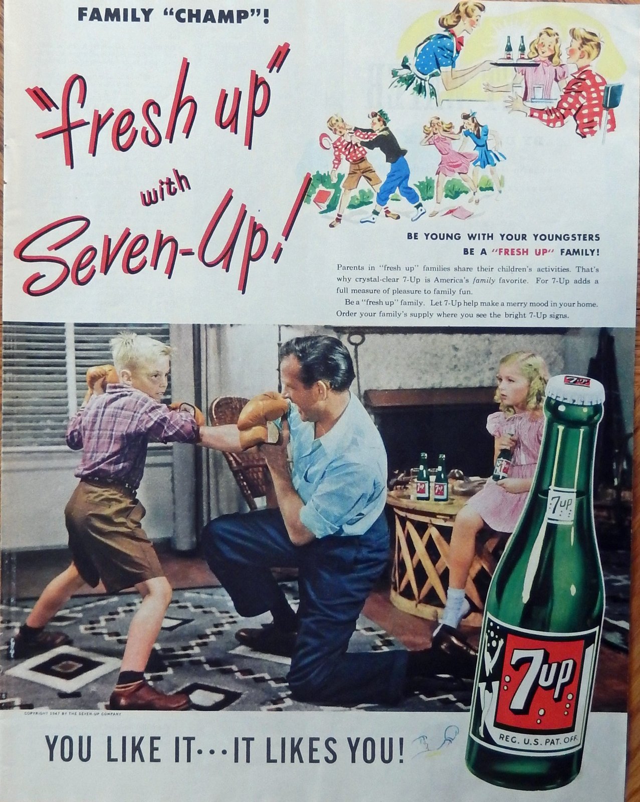 7up Soda, vintage advertisement. Color Illustration, father and son boxing, o...