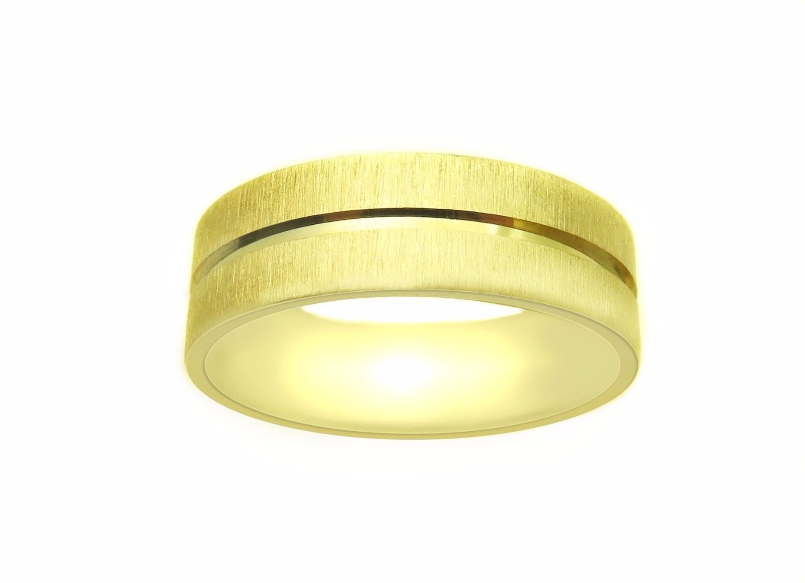 This 14k yellow gold flat surface wedding band has a matte finish with a shiny parallel cut through the center.