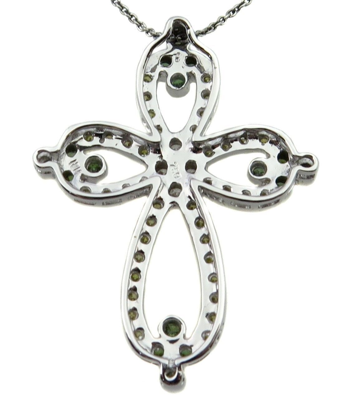This 18k white gold cross features soft curves that make for a feminine look and the entire cross is studded with a combination of white and color enhanced green and yellow diamonds weighing a total of approximately 1.06 carats.