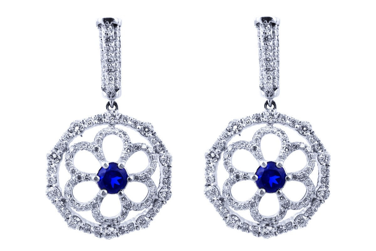 These gorgeous flower dangling earrings features round-cut diamonds with a round shape blue sapphire stone in the center. These beautiful pair of earrings is crafted in 14k white gold with a high polish finish with an omega back clasp. Total weight of diamonds approximately 1.50cts. Comes with a free gift box.