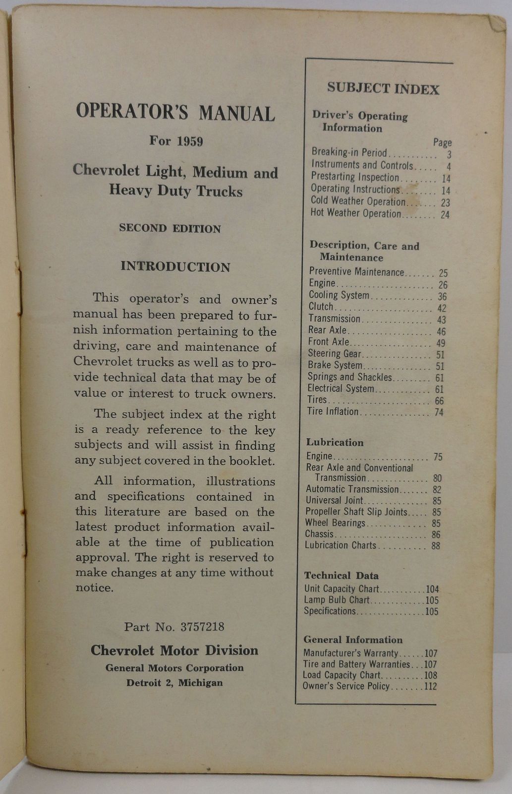 Subject Index: Driver's Operating Information; Description, Care and Maintenance; Lubrication; Technical Data; General Information (#00002276)