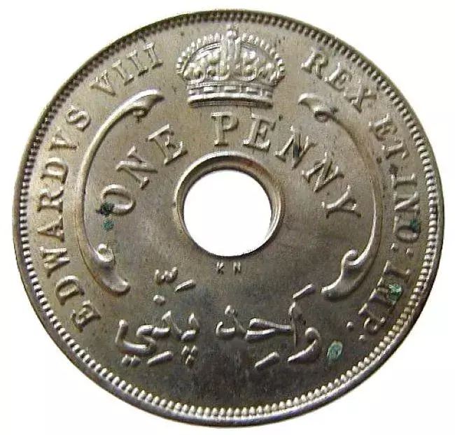 OBVERSE: An imperial crown above a central circular hole with a scroll ornament to right and left; below crown, ONE PENNY; around, outside the scroll ornaments, EDWARD VIII REX ET IND: IMP:; below hole in Arabic, the denomination; the mint mark, KN, below the central hole.
