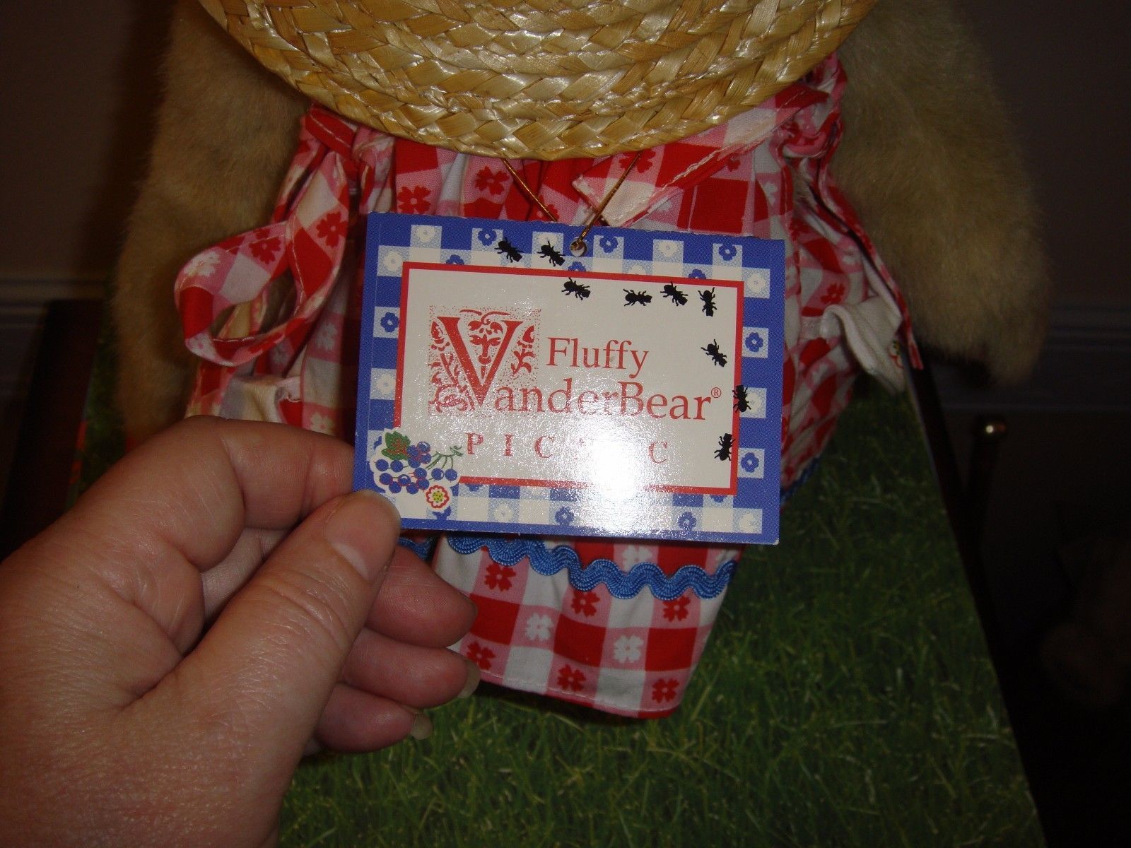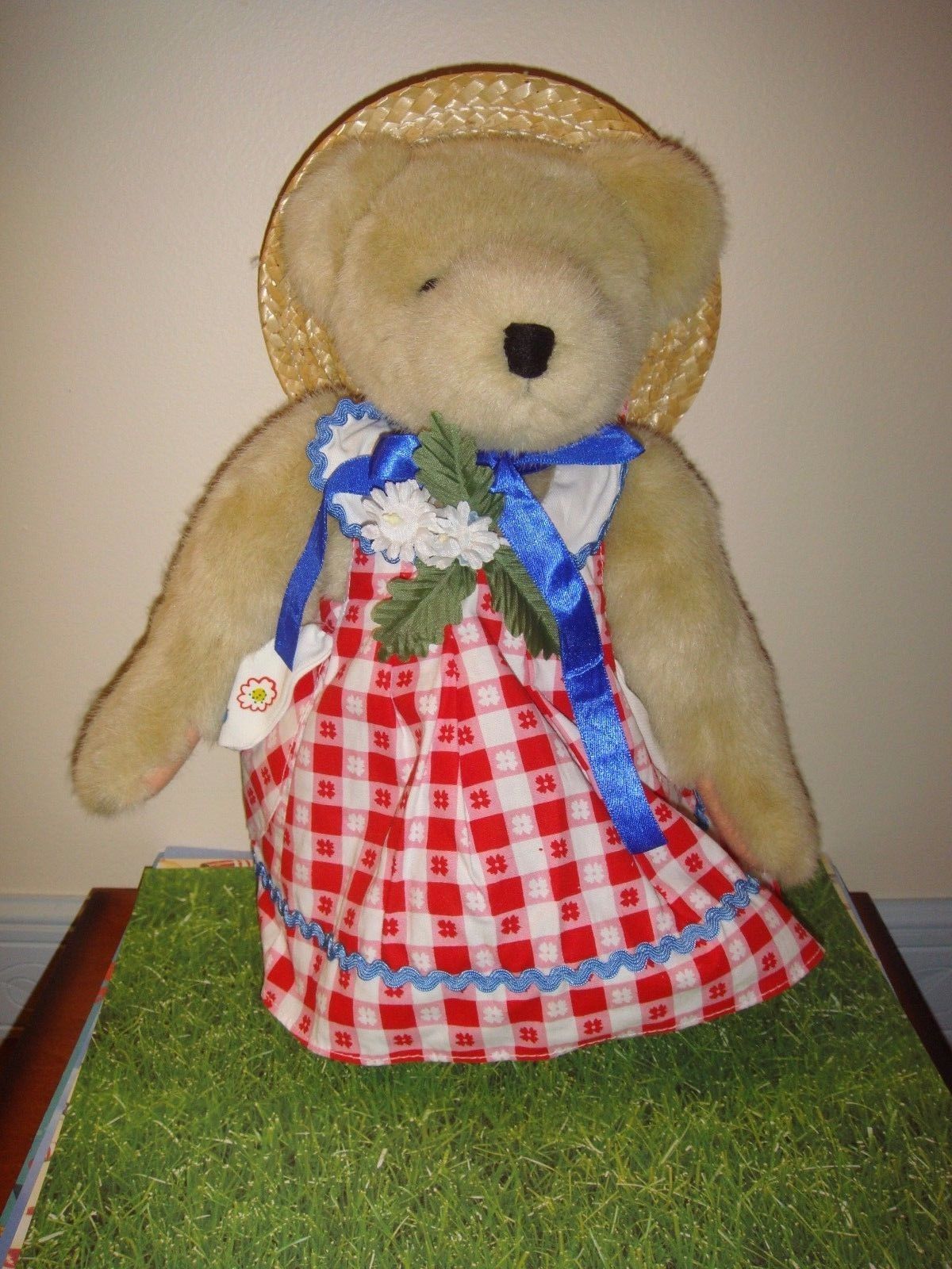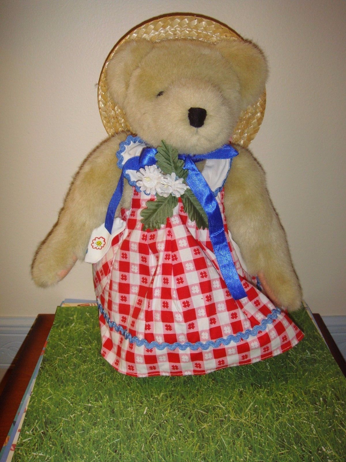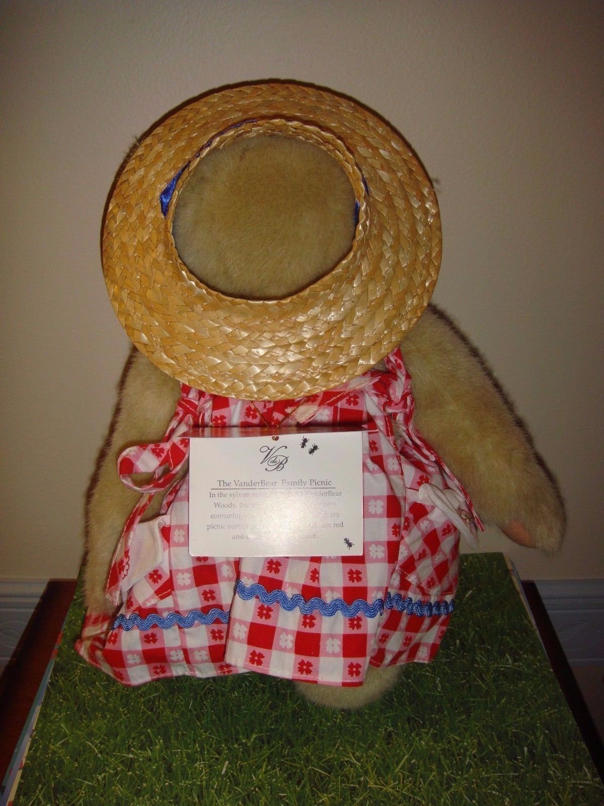 Muffy VanderBear Fluffy Picnic Collection, Dressed With Hang Tag, Gently Used In Display Only. She's Wearing Checkered Sundress With White Pique Napkin Print Trim And Bouquet On Bodice, Peek A Boo Hat.