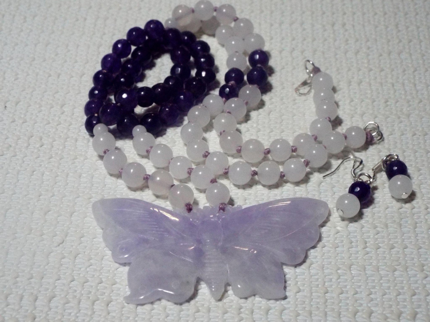 This necklace measures 22 inches, I used a Natural, not processed Jadeite lavender pendant bead. This pendant has some lavender and white in it. It is very translucent. The beads are natural white nephrite jade, 8mm round beads,and 8mm faceted amethyst beads. Hand knotted on lavender silk thread. The pendant is a large pendant it is 2.5 inches x 1.5 inches, The ear wires and hook clasp are sterling silver marked 925. The earrings drop 1.5 inches. I offer a 7 day trial, and this item ships in a gift box.