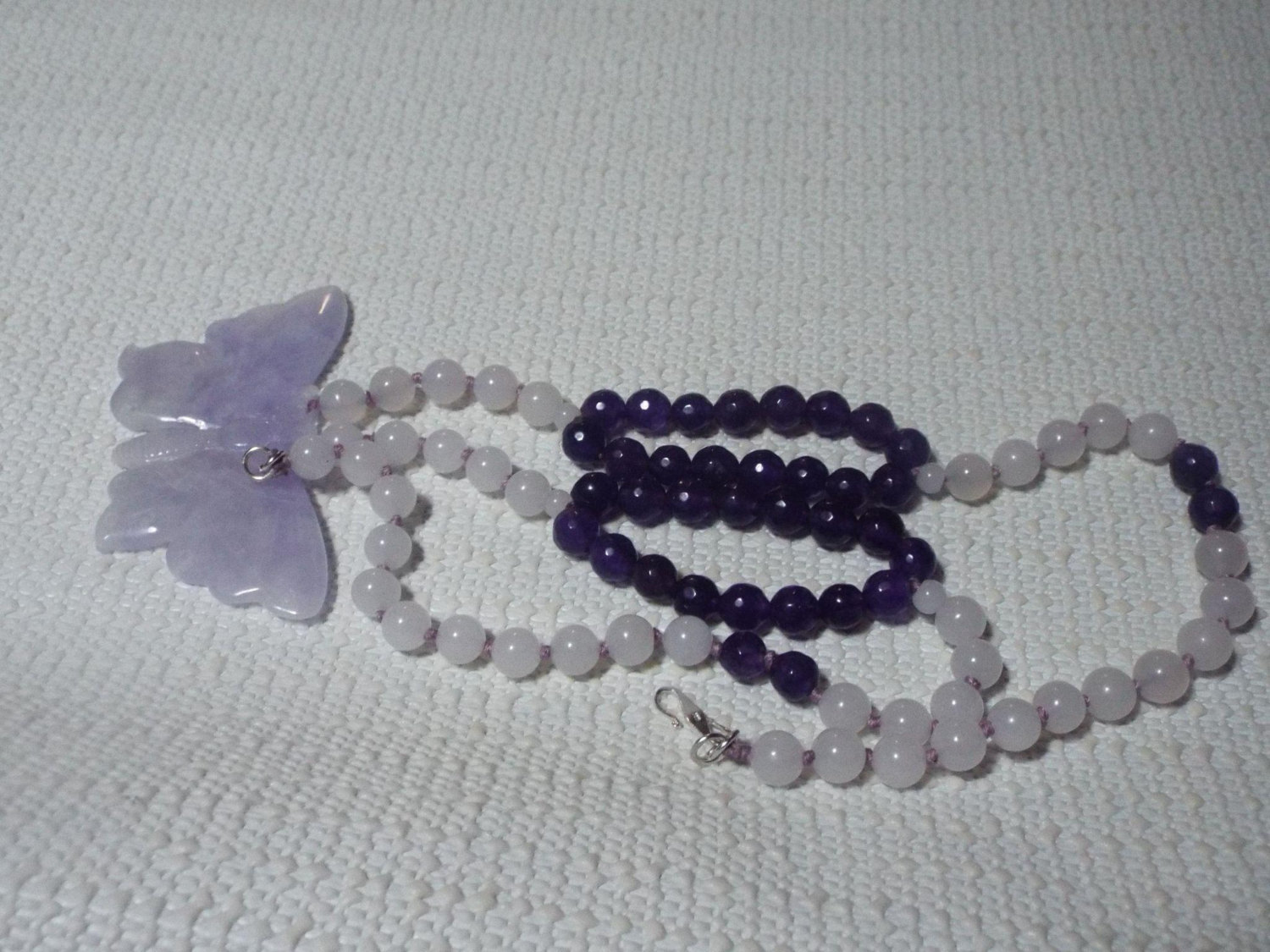 Natural Lavender Jadeite Butterfly Pendant, Nephrite And Amethyst Beads Necklace