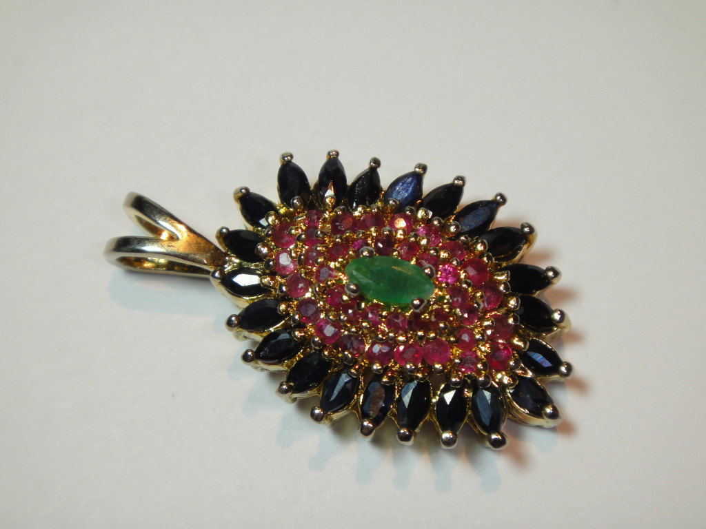 large pendant with real genuine gemstones ruby, blue sapphires, emerald estate