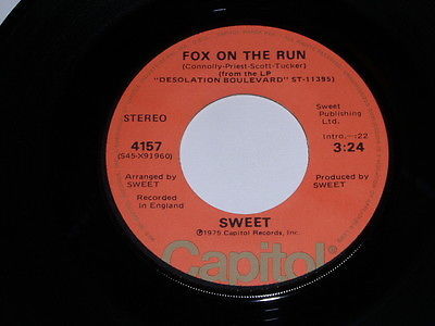 This is a vintage 45 rpm phonograph record by Sweet, entitled, "Burn On the Flame". Flipside: "Fox On The Run". Record label: Capitol 4157.