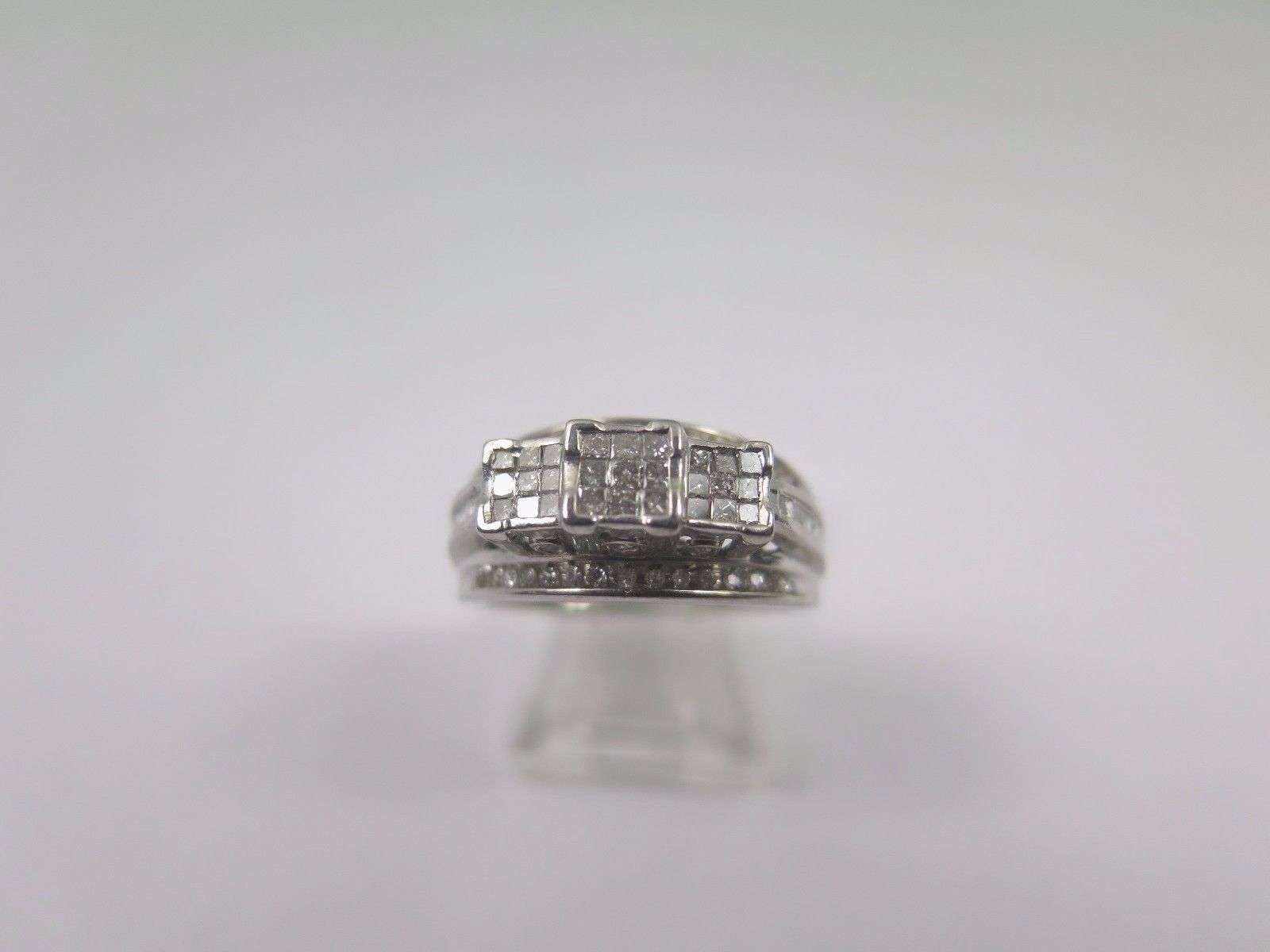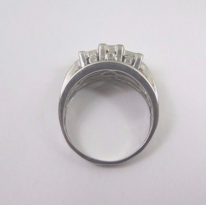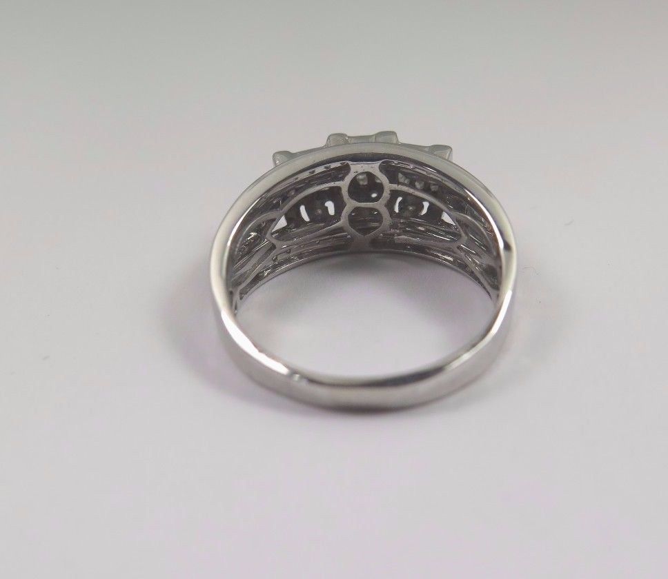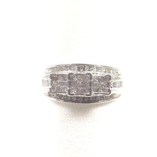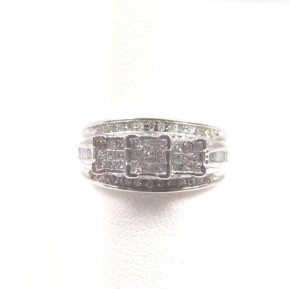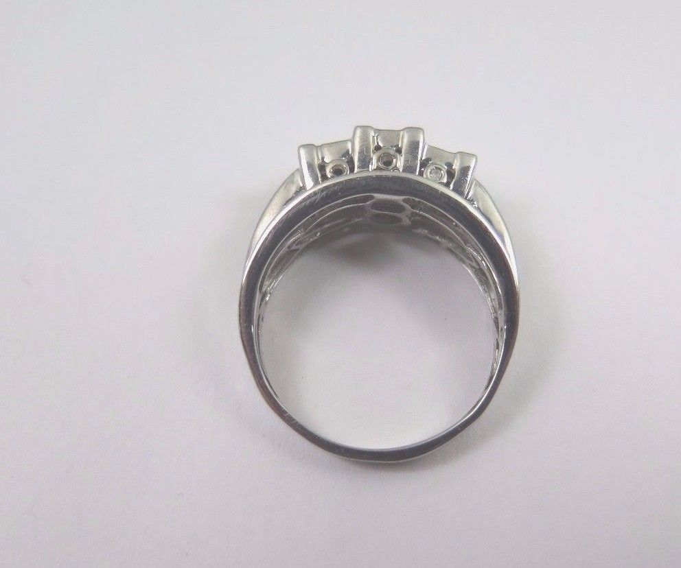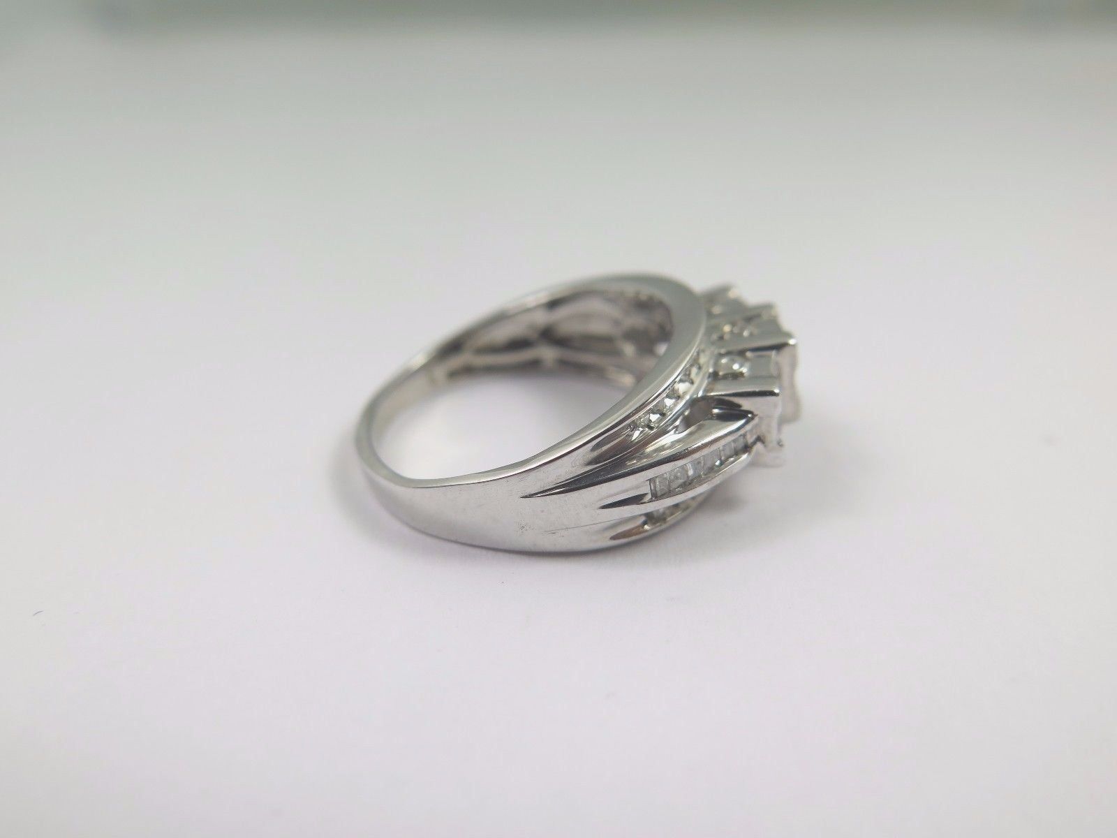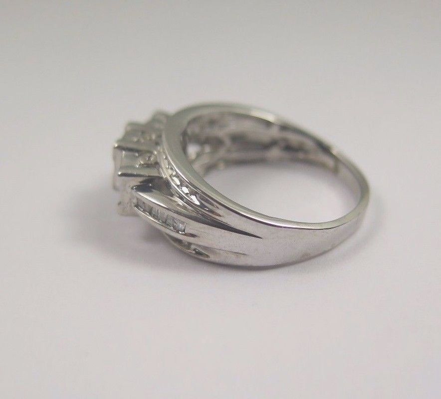 Here we have a beautiful 10k white gold women's diamond past, present and future ring with princess cut, round cut and baguette diamonds throughout the ring. Total weight is 3.4g. Width 9mm. Height 6.5mm. Ring is pre- owned and will show normal wear, missing two small round cut diamonds on the side of the settings as seen in pictures above. Selling as is. Comes with a free gift box. The perfect diamond ring for your loved one. Thanks for looking and have a great day.