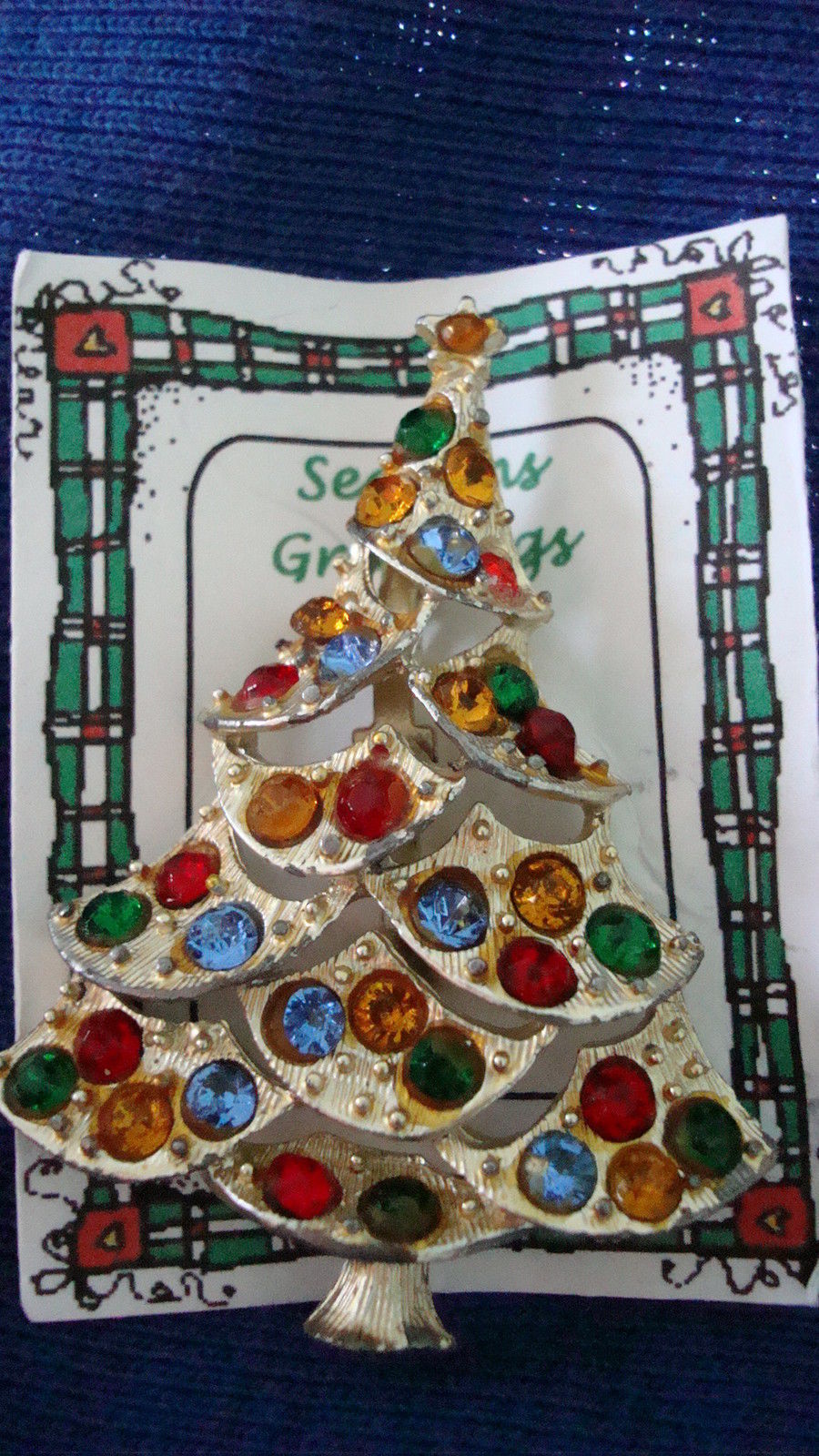 Christmas PIN #0417 Vintage Goldtone & Colored Faceted Rhinestone Ornaments Tree