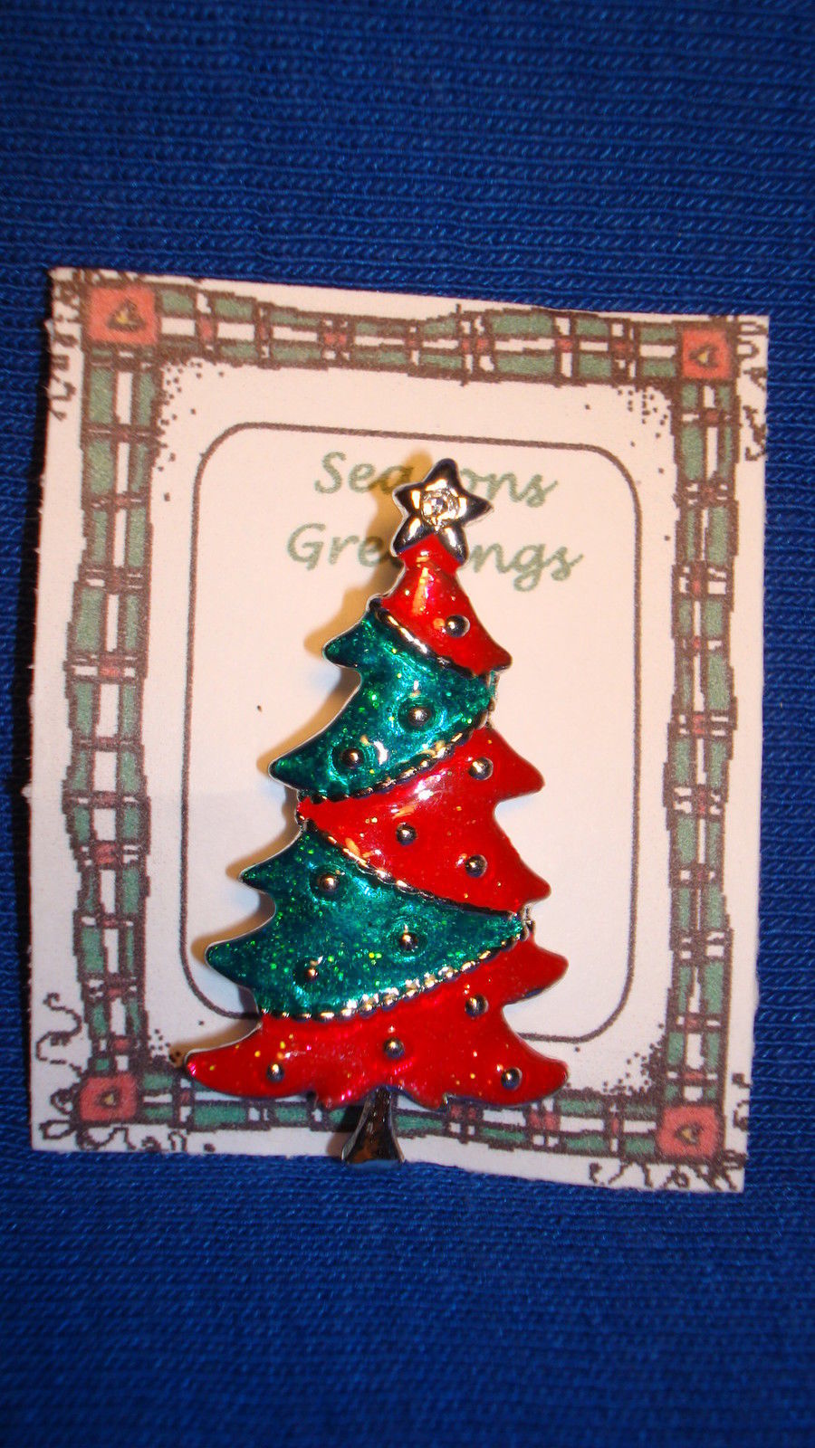 This is a Beautiful Silvertone with Red Green Enamel Christmas Tree Pin. There is a clear rhinestone in the Star on the top of the tree. This is a really pretty piece of jewelry.