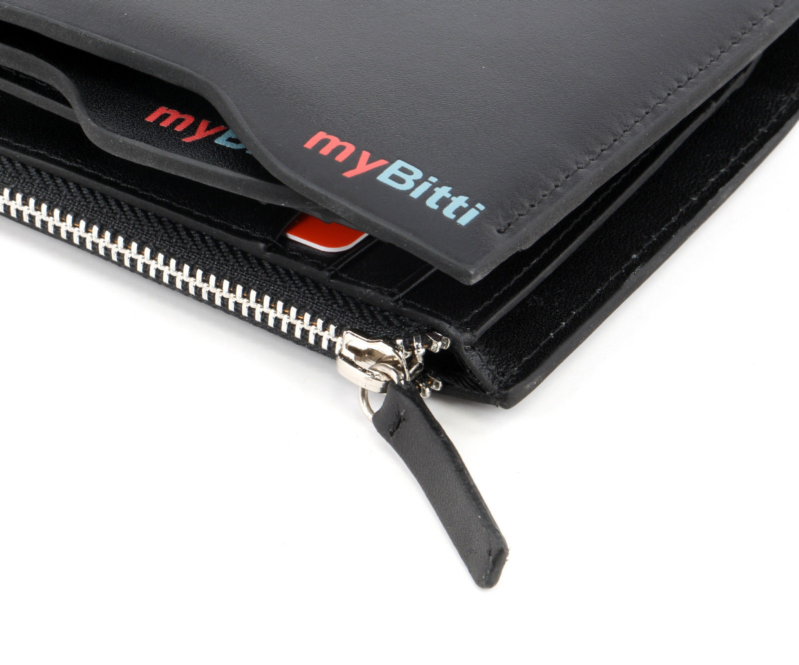 2 money position, one ID window, one driving license position, one zipper pocket for coins.
