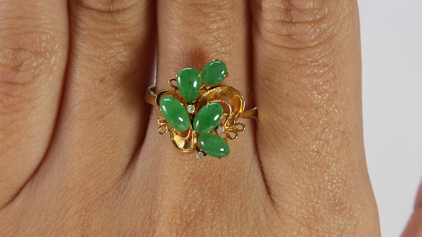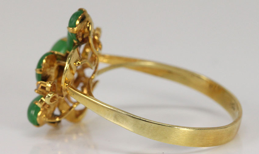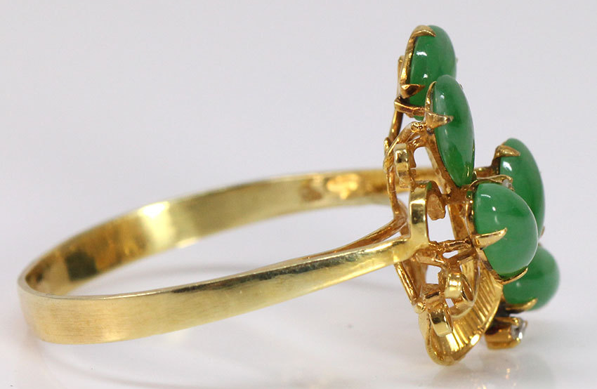 VINTAGE 1970'S 14K YELLOW GOLD JADEITE GRASS GREEN CABOCHONS DIAMOND RING (SZ 7.5)