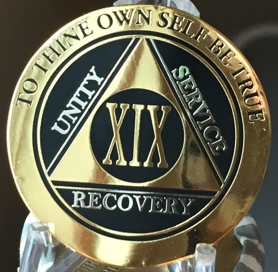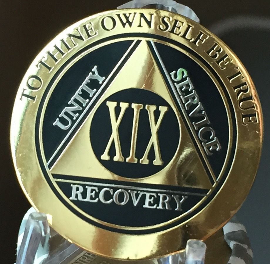 19 Year AA Medallion Black Gold Plated Bi-Plate Alcoholics Anonymous Chip Coin