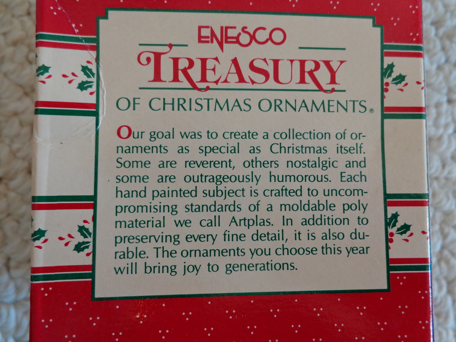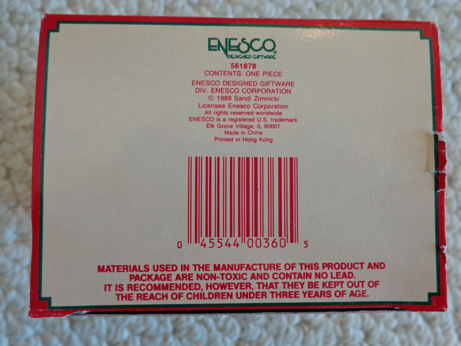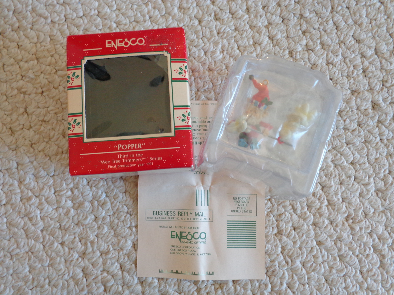 This is an ENESCO “POPPER” #561878 HOLIDAY ORNAMENT (1702). Third Issue in the “Wee Tree Trimmers” Series Final production year 1991. Designer: Sandi Zimnicki, 1989. Enesco Designed Giftware, Division Enesco Corporation. Enesco Corporation Enesco is a registered U.S. trademark Elk Grove Village, IL. 60007, was made in China and Printed in Hong Kong. Materials used in the manufacture of this product and package are non–toxic and contain no lead. It is recommended however, that they be kept out of the reach of children under three years of age. #045544003605. It was used, but was kept boxed. The box does show some wear, but the ornament is in excellent condition. (Please see pix for complete description)