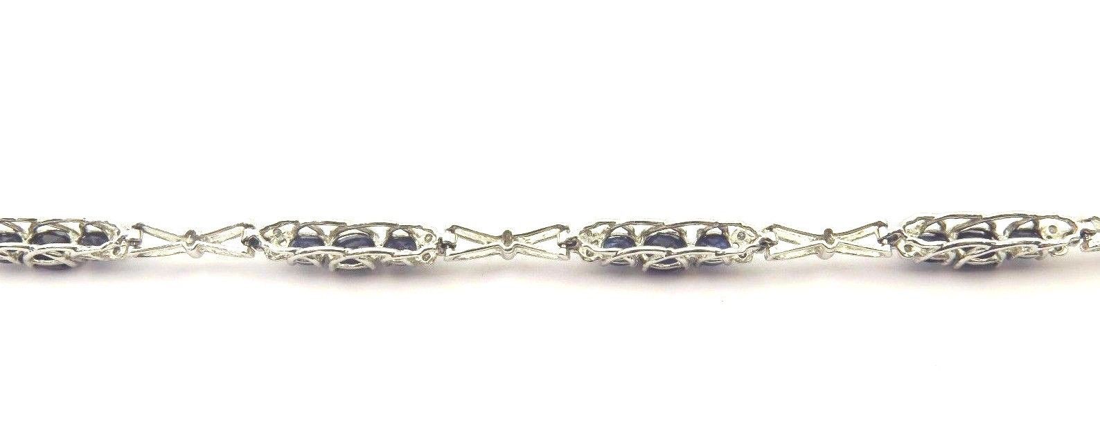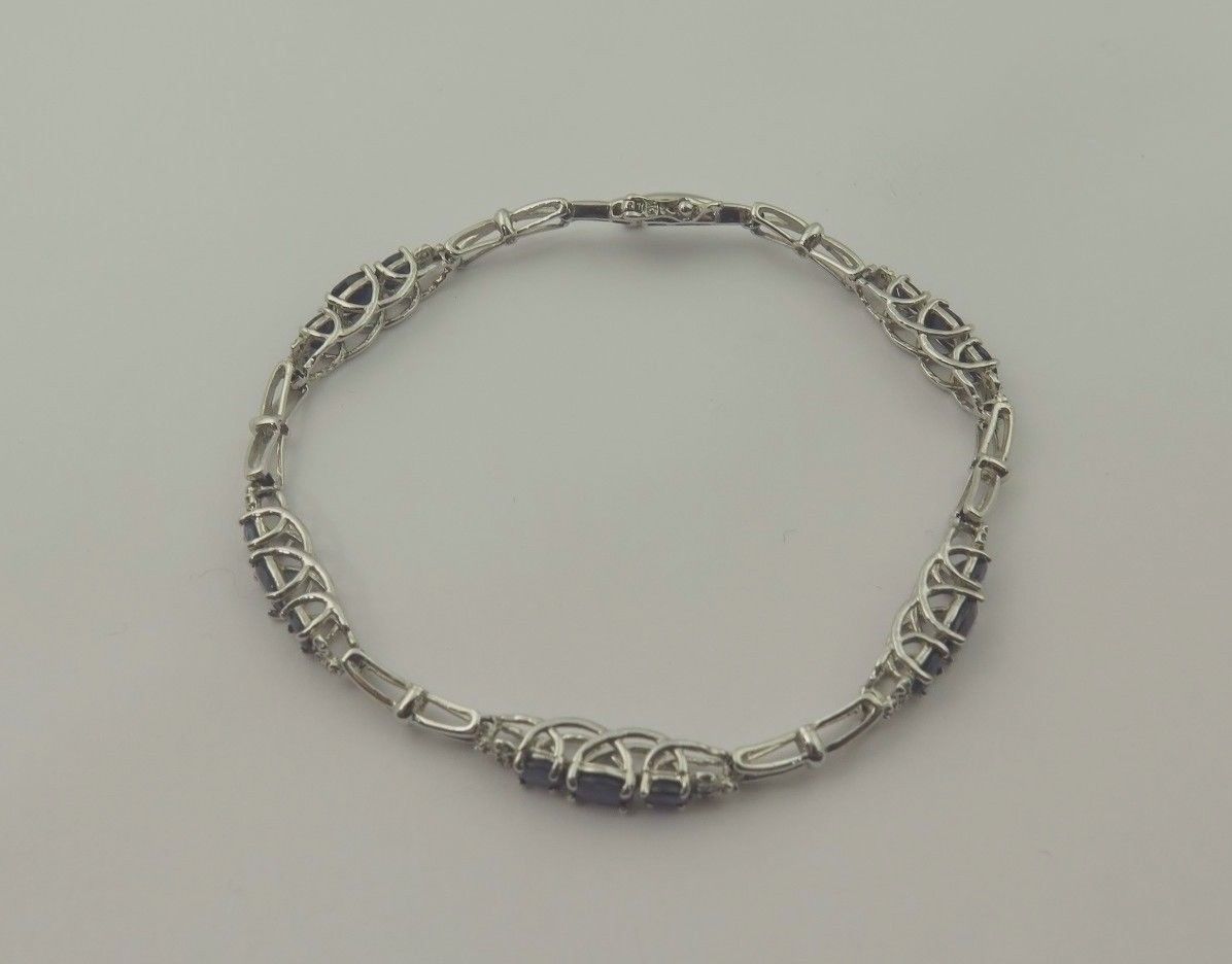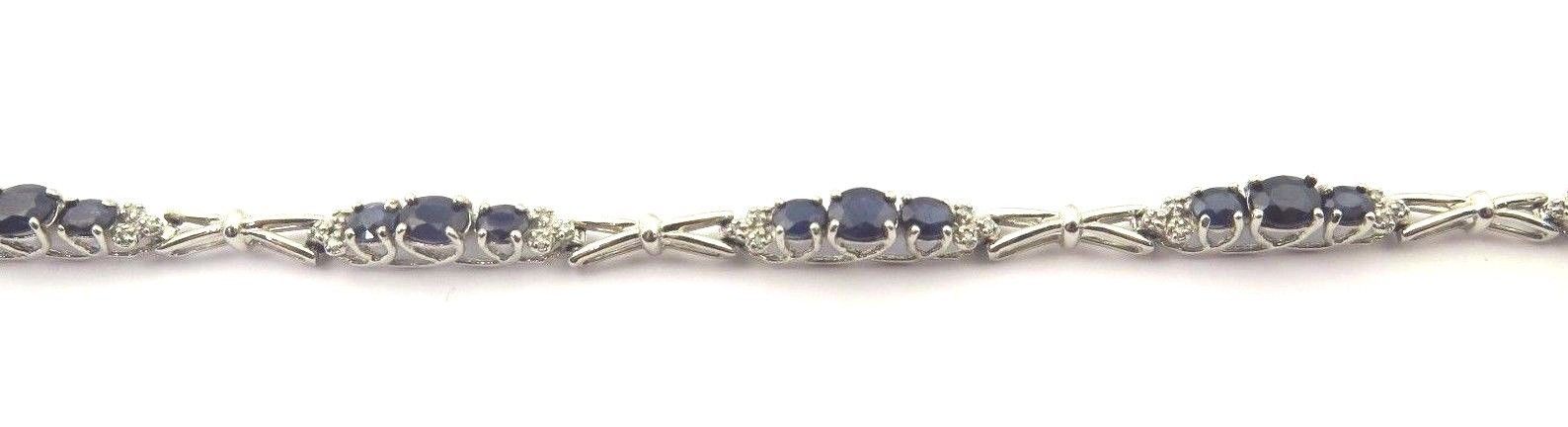 Here we have a beautiful 10k White Gold Sapphire September Birthstone Tennis Bracelet With Diamonds. Total weight of genuine sapphires is approximately 2.50ct. Diamond weight: 0.20ct. Color: G-H. Clarity: Si. Total weight: 7.3g. Width: 4mm. The perfect gift for your loved one. Comes with a free gift box. Buy with confidence, we only sell top quality items. Thanks for looking and have a great day.
