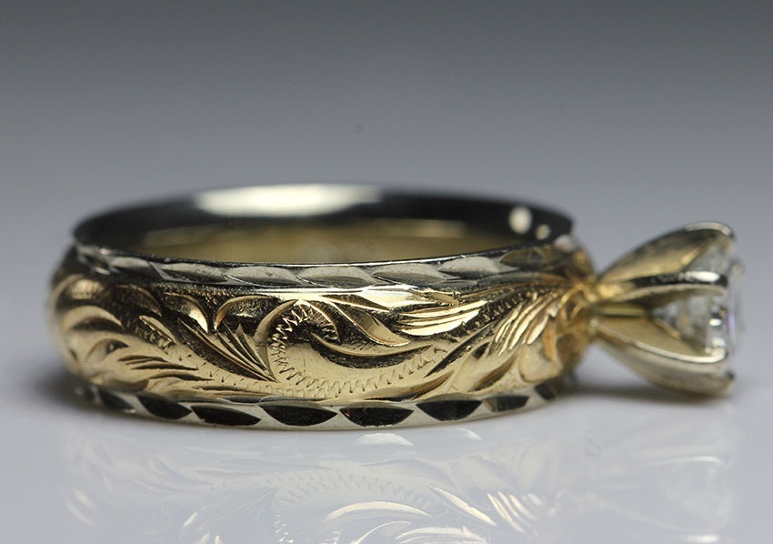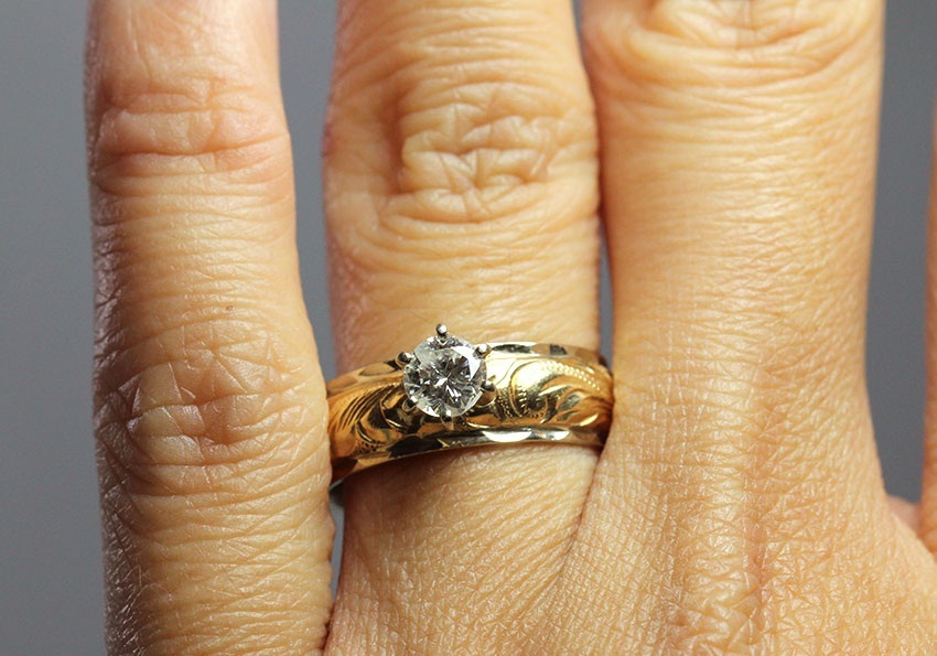 You are bidding on a LADY'S 14K GOLD CARVED FLORAL DIAMOND ENGAGEMENT RING - 0.5 CT ROUND BRILLIANT SI CLARITY.