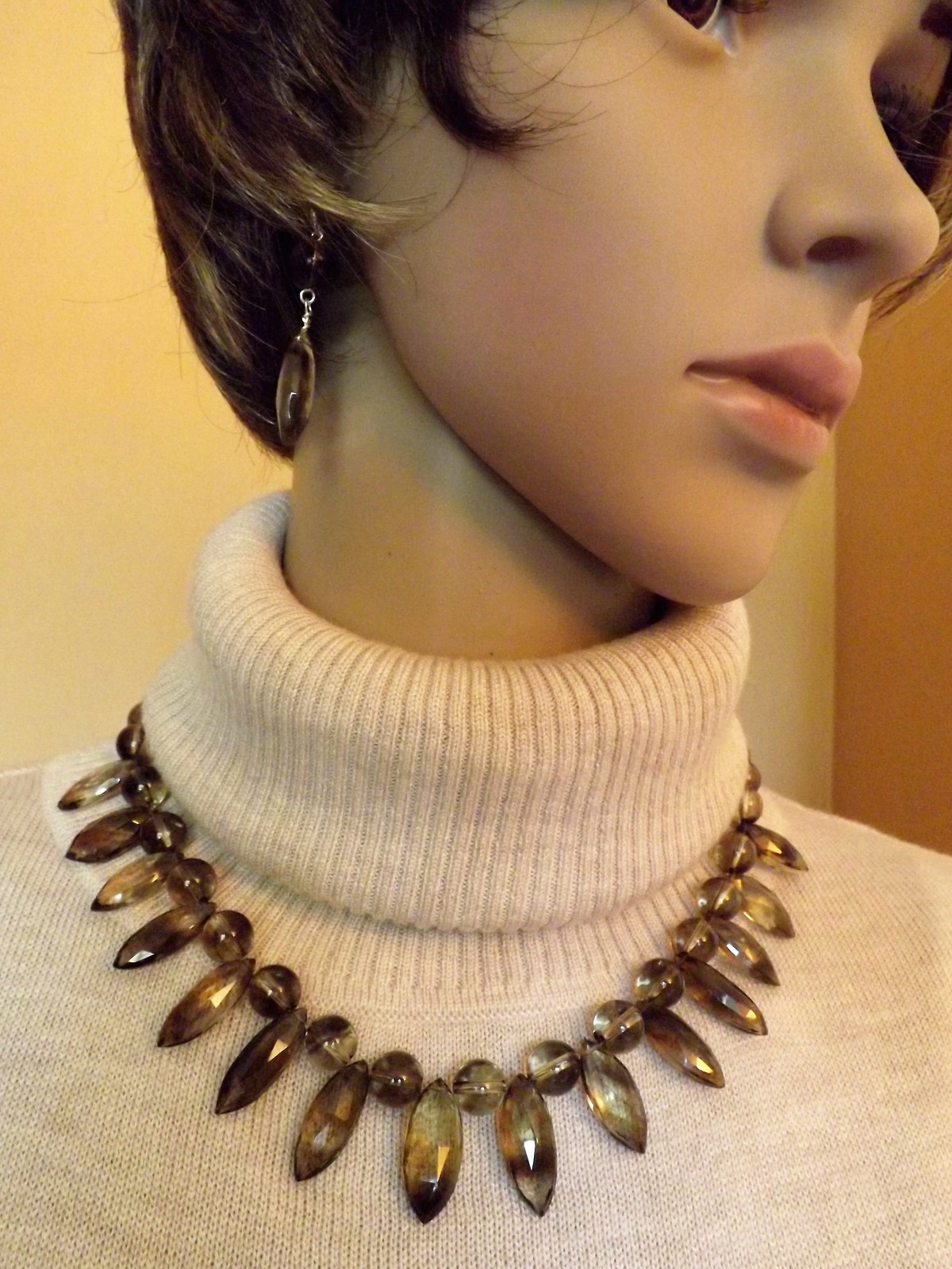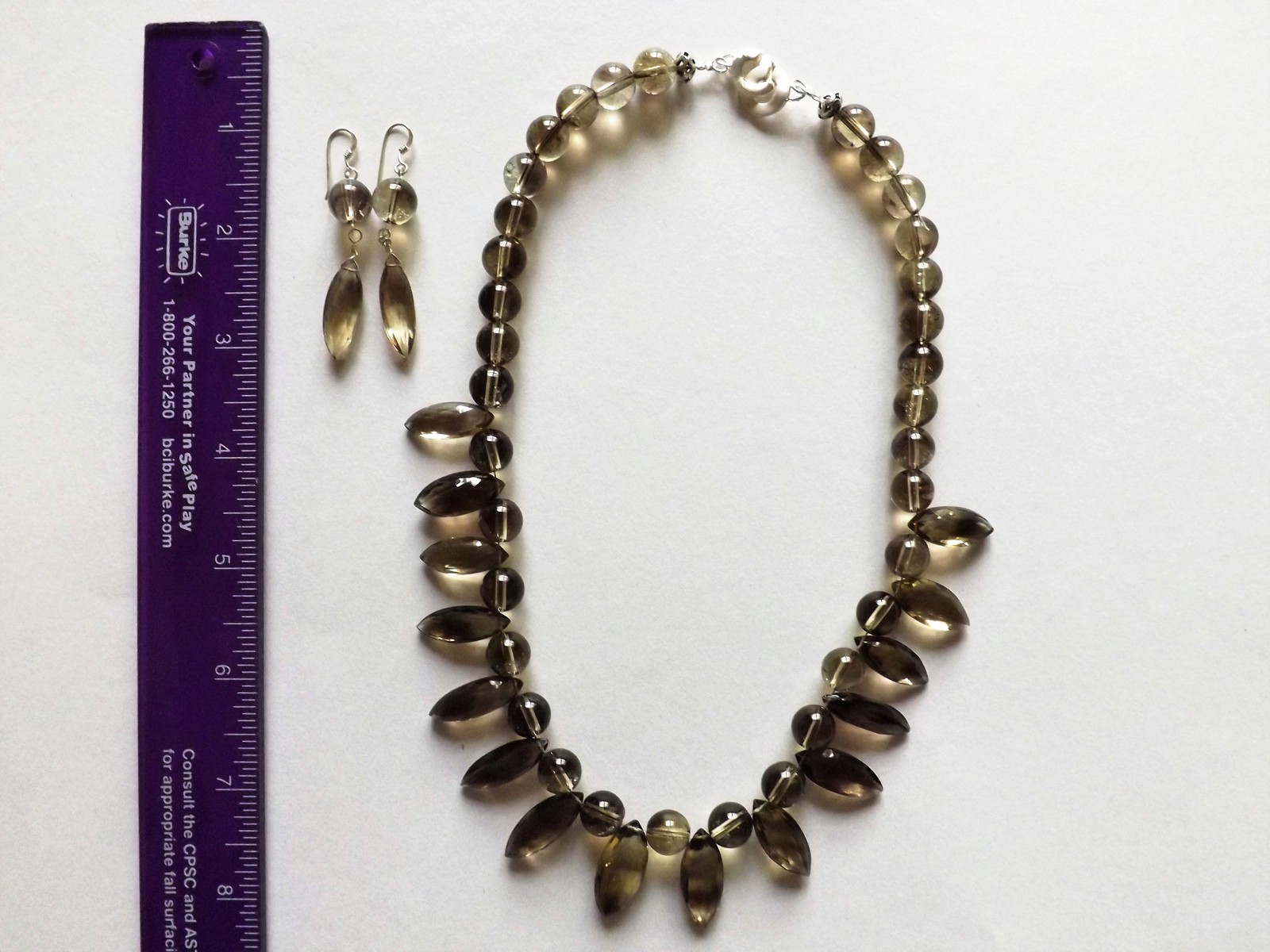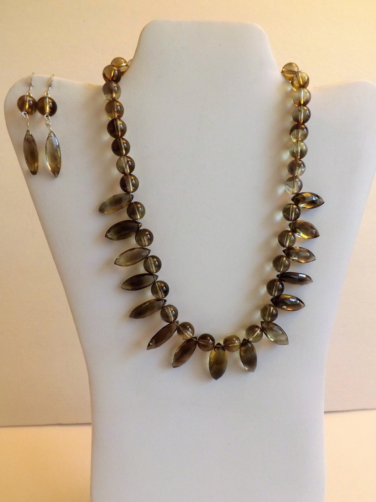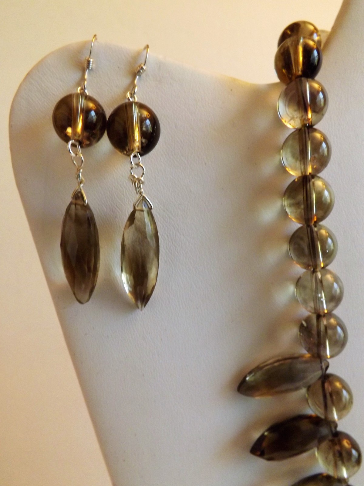 Natural smoky and lemon phantom Quartz faceted marquis-shaped beads combined with round beads and sterling silver findings for a refine look. Necklace measures 17", earrings 2".