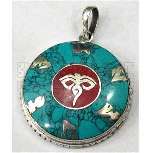 Delicate Tibetan Turquoise Coral Inlay Brass Buddha Eye Om Mani Amulet Pendant