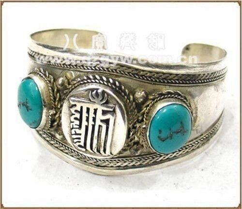 Huge Tibetan 2 Big Turquoise Gemstone Delicately Carved Kalachakra Cuff Bracelet